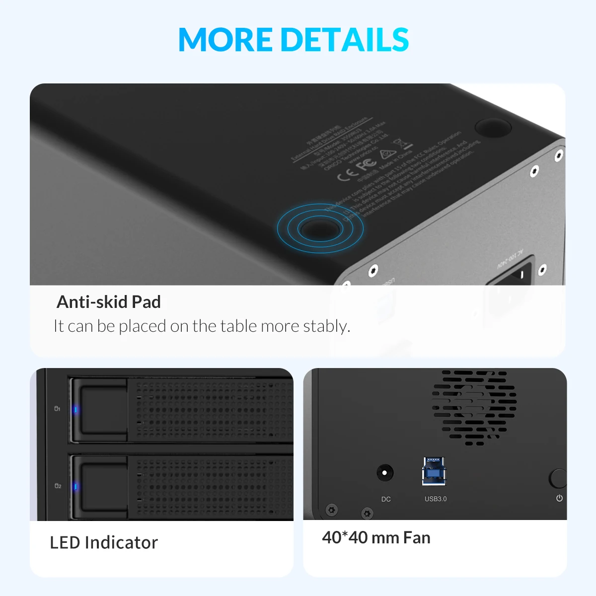 La carcasa HDD de 2 bahías cuenta con una carcasa de aleación de aluminio Unibody, buena disipación de calor, hasta 4mm de espesor que es firme y confiable, diseñado con orificios de ventilación que ayudan a acelerar la circulación de aire y la ventilación de calor para enfriar eficazmente la unidad y todo el sistema para un funcionamiento estable y una vida útil prolongada.