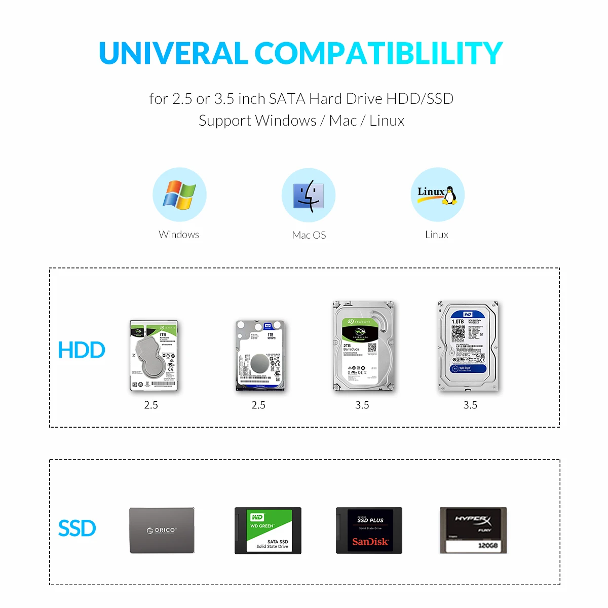 Se adapta a la mayoría de HDD y SSD SATA de 2,5/3,5 pulgadas.
