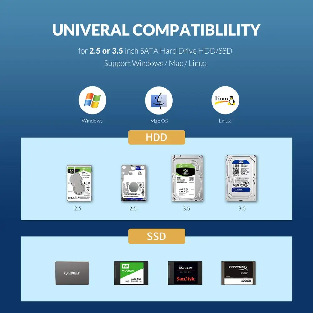 Se adapta a la mayoría de HDD y SSD SATA de 2,5/3,5 pulgadas.