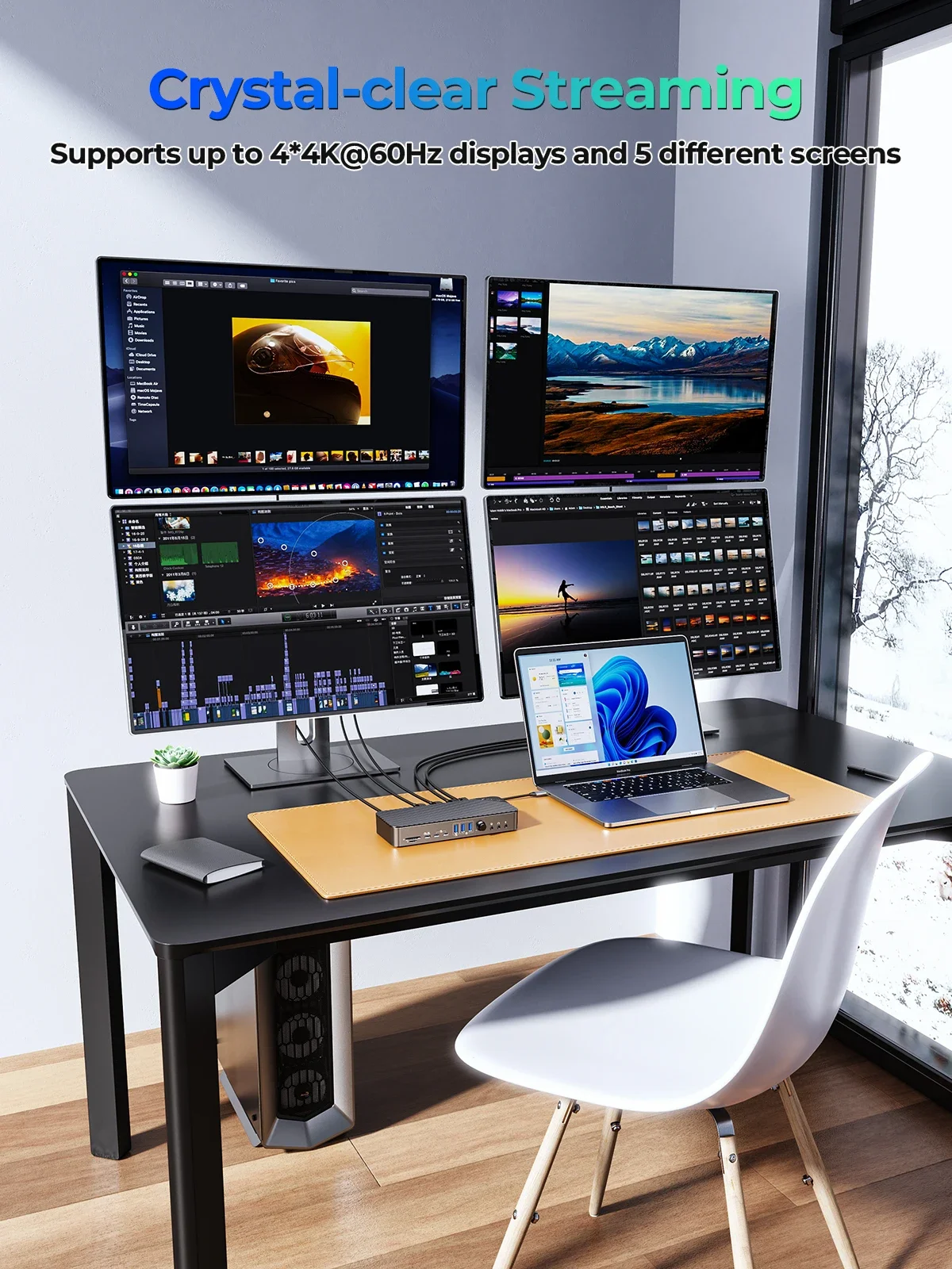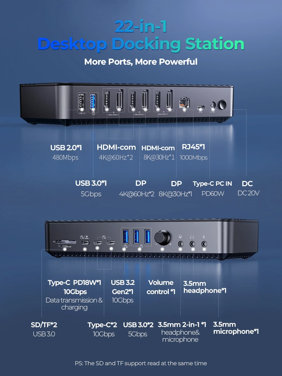 22 En 1: 4*4K @ 60Hz y 5 pantallas diferentes con tecnología DisplayLink.PD: el soporte SD y TF se lee al mismo tiempo
