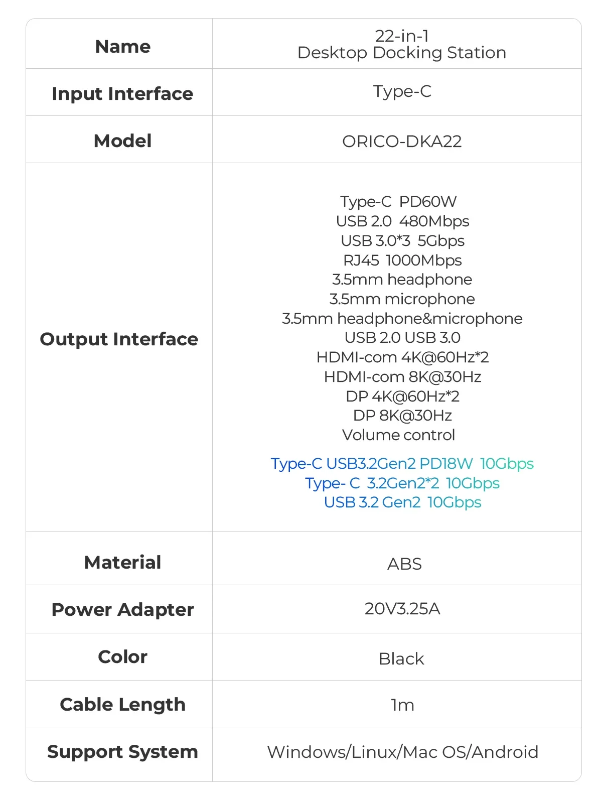 Tipo-C 10Gbps PD18W + Tipo-C 10Gbps * 2 + 10Gbps * 1 + USB2.0 + USB3.0 + RJ45 + SD/TF + HDMI-com 4K @ 60Hz * 2 + HDMI-COM 8K @ 30Hz * 1 + DP4K @ 60Hz * 2 + DP8K @ 30Hz * 1 + 3,5mm auriculares * 1 + 3,5mm micrófono * 1 + 3,5 MM 2 en 1