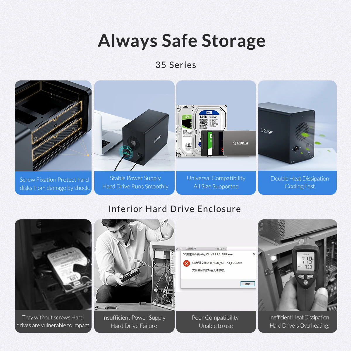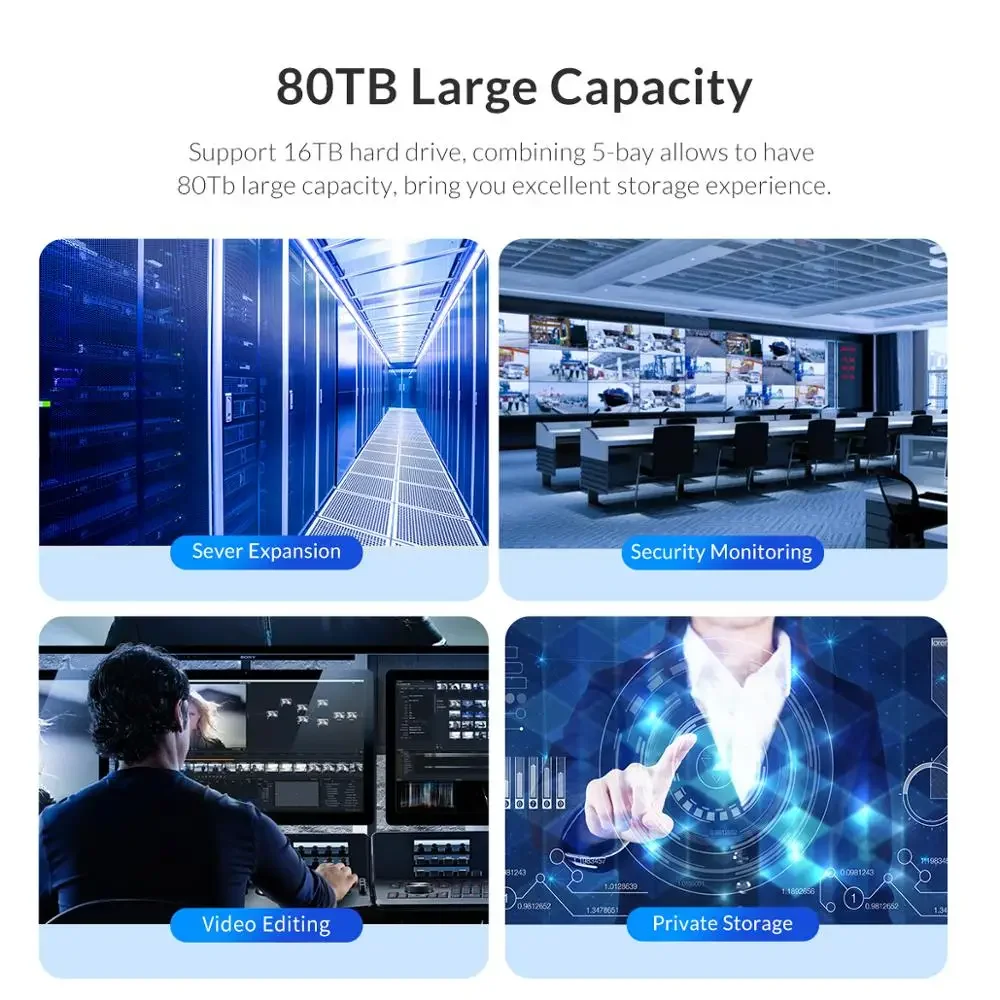 1.Admite almacenamiento de gran capacidad de 80 TB (16 TB x 5). El disco único admite discos duros de clase empresarial de 16 TB; es más seguro para los discos duros de gran capacidad quitarlos y almacenarlos.(No función RAID, no NAS)