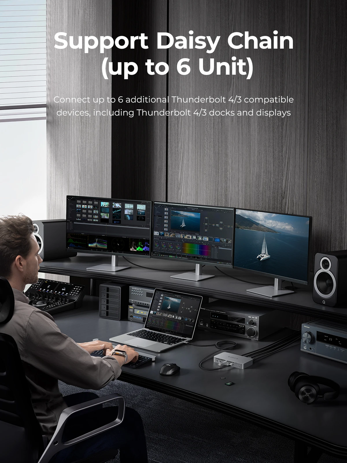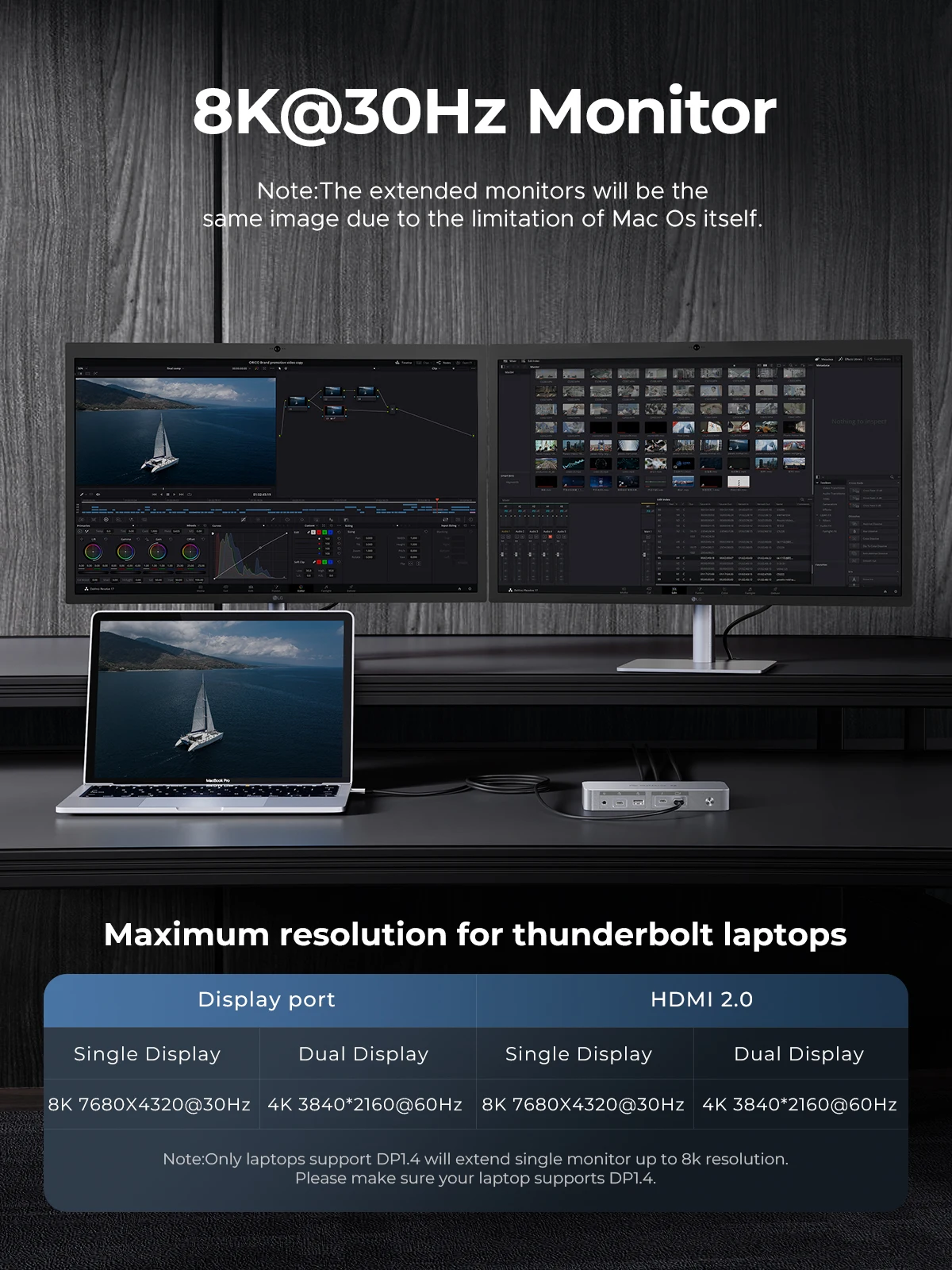 La estación de acoplamiento de monitor triple Thunderbolt 4 ha sido aprobada por puertos Thunderbolt 4 certificados por Intel.Doble puerto Thunderbolt 4.Triple salida de hasta 8K@30Hz a través del puerto Thunderbolt 4 y DisplayPort.(NOTA: Macbooks con chip M1 solo pueden ampliar dos monitores debido a las limitaciones del chip Apple) La calidad de la pantalla es excelente, sin demoras y sin una sincronización de sonido perfecta