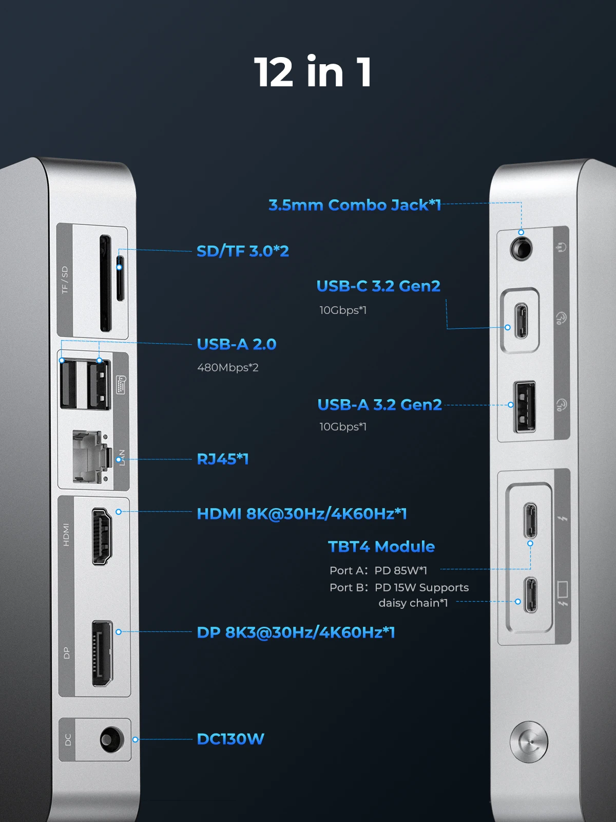 La expansión multifuncional Thunderbolt 4 para satisfacer sus necesidades.expande su computadora portátil a 1 puerto Thunderbolt 4 (para PD85W, transferencia de datos de 40 Gbps), 1 puerto Thunderbolt 4 (para Daisy Chain, transferencia de datos de 40 Gbps), puerto de pantalla 1x8K, compatible con HDMI 1x8K, 1xUSB-C 3.2 puertos Gen2 (10 Gbps), 1xUSB-A 3.2 puertos Gen2 (10 Gbps), 2xUSB 2.0 puertos, Gigabit Ethernet, puerto SD/TF, 3.Puerto de audio/micrrófono de 5 mm
