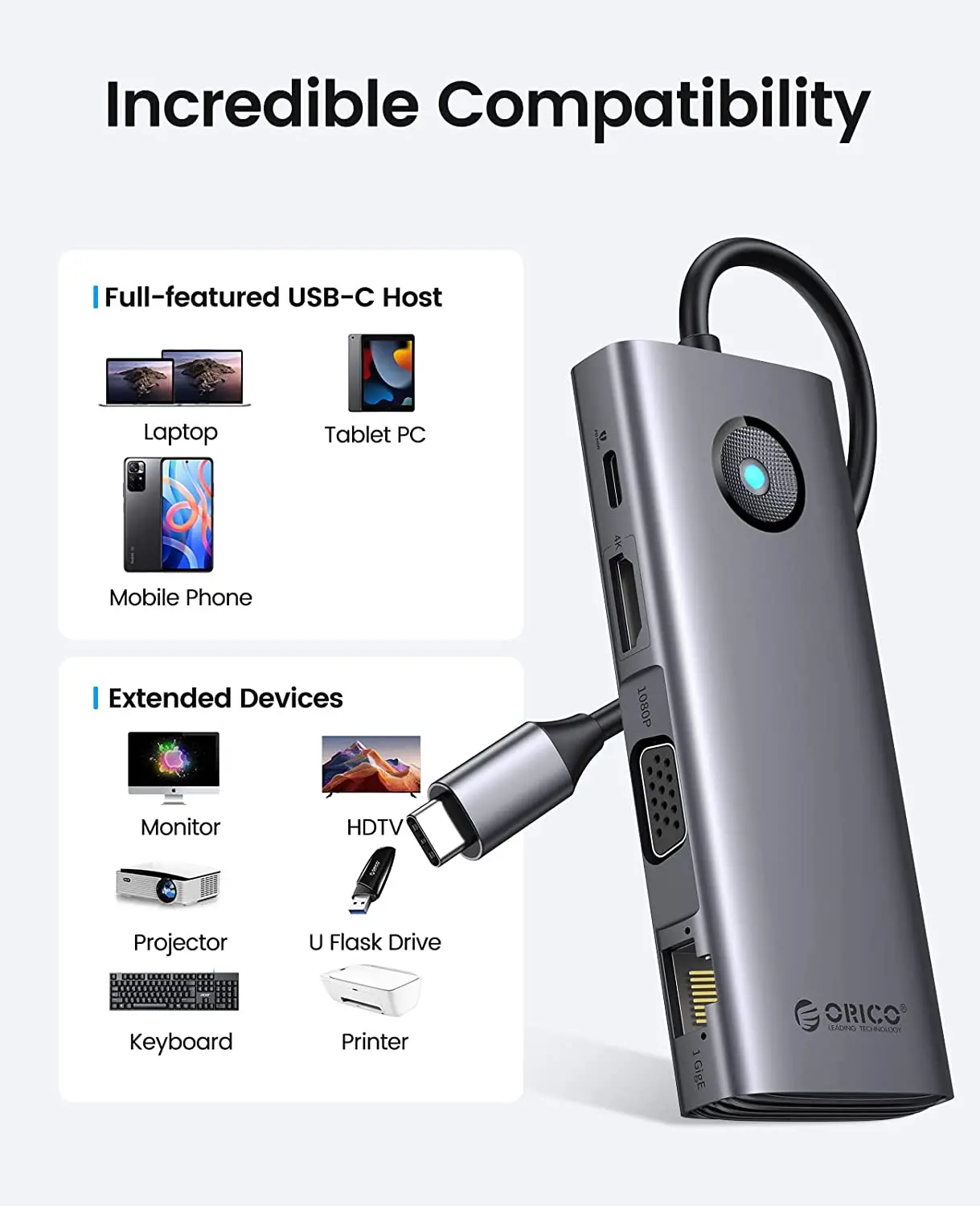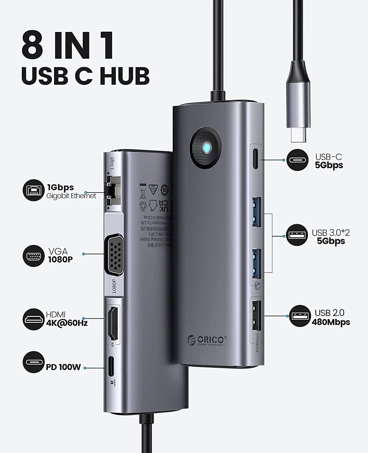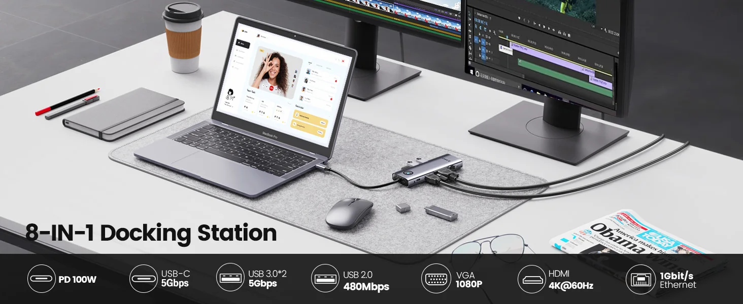 2. 8-in-1 VGA RJ45 : USB3.0*2(5Gbps) + USB2.0*1(480MBps)+ USB-C*1(5Gbps)+ PD100W*1 + HDMI-compatible*1(4K@60Hz)+ VGA*1(1080P@60Hz)+ RJ45(GigE)*1