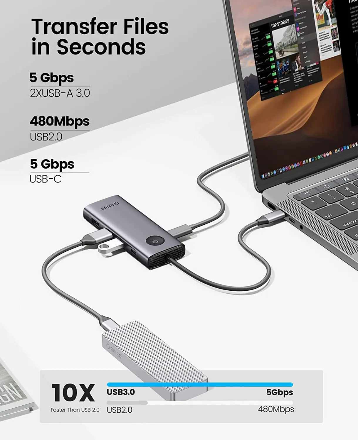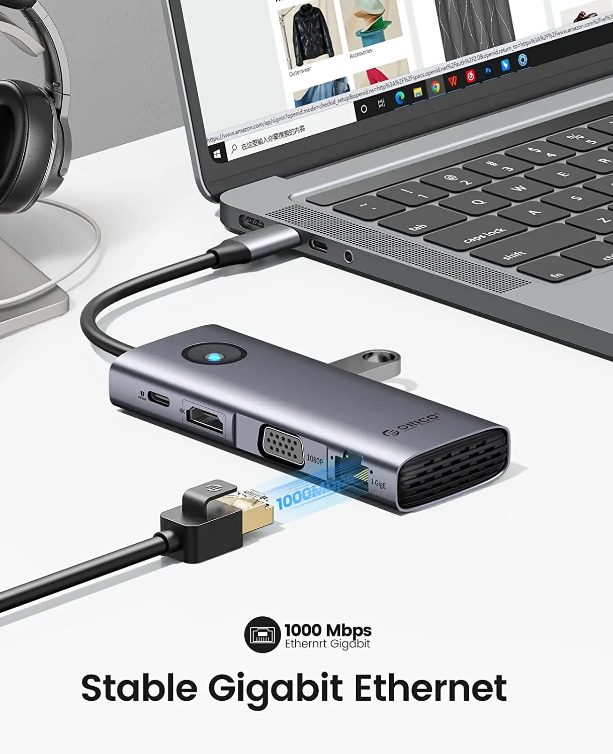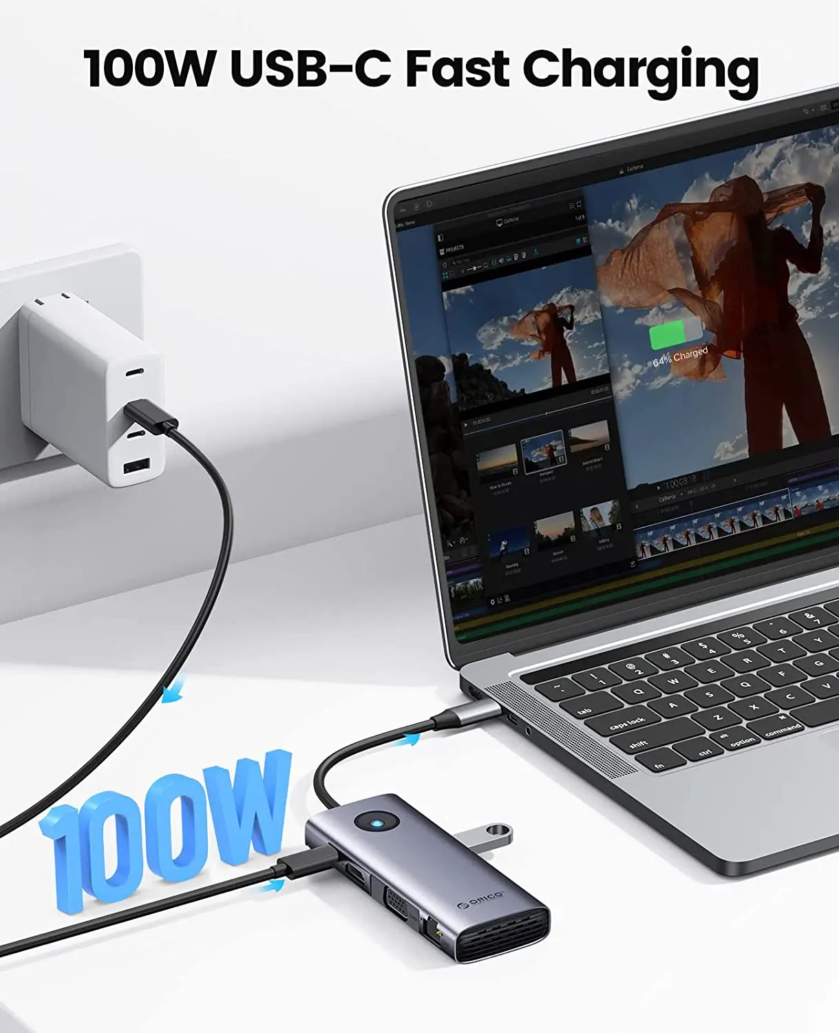 2. 8-in-1 VGA RJ45 : USB3.0*2(5Gbps) + USB2.0*1(480MBps)+ USB-C*1(5Gbps)+ PD100W*1 + HDMI-compatible*1(4K@60Hz)+ VGA*1(1080P@60Hz)+ RJ45(GigE)*1