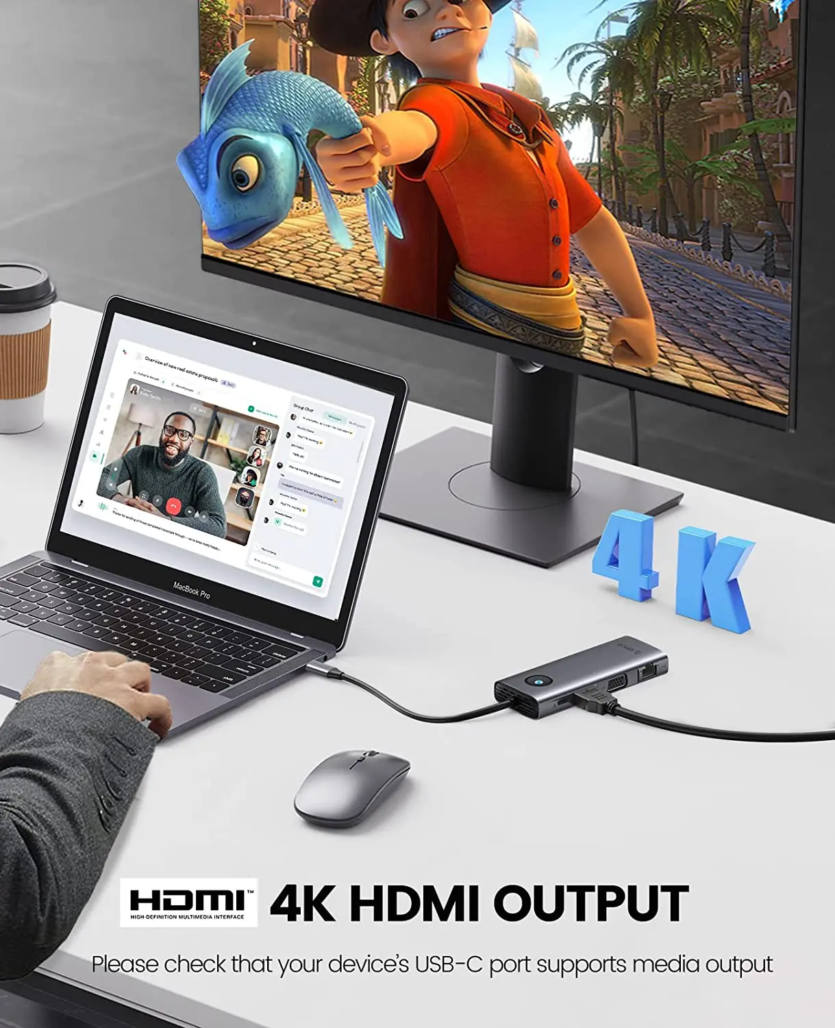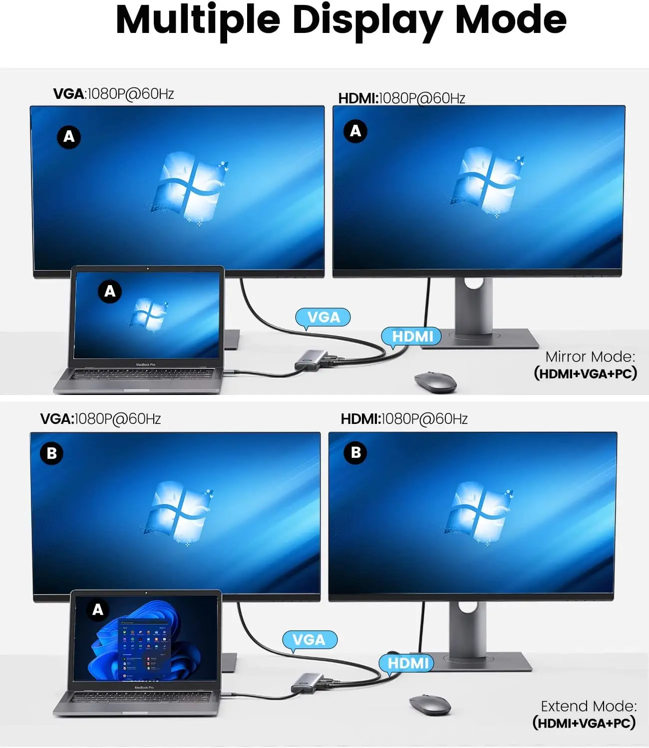 5. 12-in-1 VGA : PD 100W *1+USB3.0*2 (5Gbps)+USB2.0 *1 (480Mbps)+USB-C*1(5Gbps) + HDMI-compatible*2(4K@60Hz)+VGA*1(1080P@60Hz)+SD 5Gbps+ TF3.0 5Gbps+RJ45(GigE)*1+Audio *1 (CTIA),SD and TF cards can be used at the same time