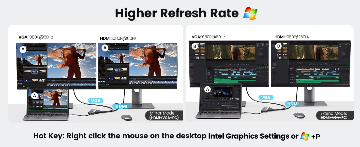 7. 12-in-1 VGA with RGB : PD 100W *1+USB3.0*2 (5Gbps)+USB2.0 *1 (480Mbps)+USB-C*1(5Gbps) + HDMI-compatible*2(4K@60Hz)+VGA*1(1080P@60Hz)+SD 5Gbps+ TF3.0 5Gbps+RJ45(GigE)*1+Audio *1 (CTIA)+RGB Light,SD and TF cards can be used at the same time