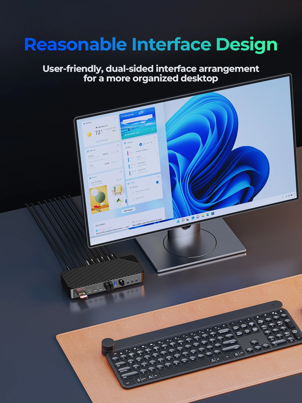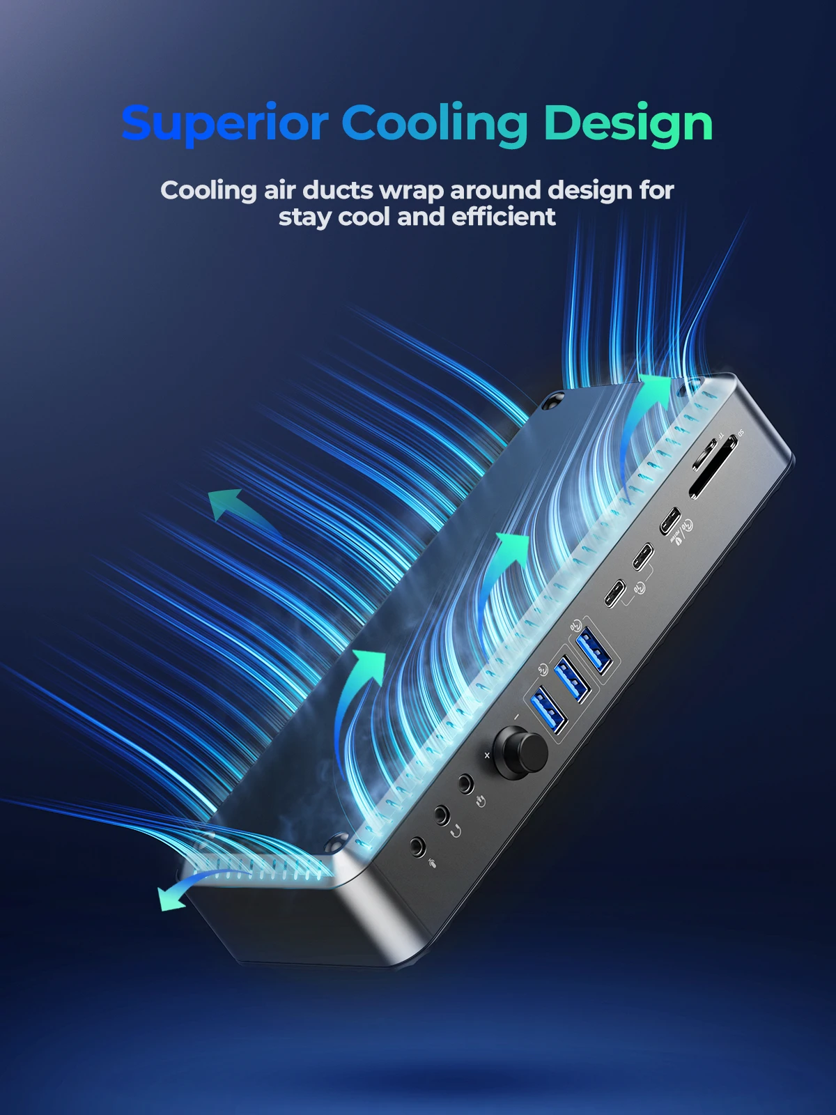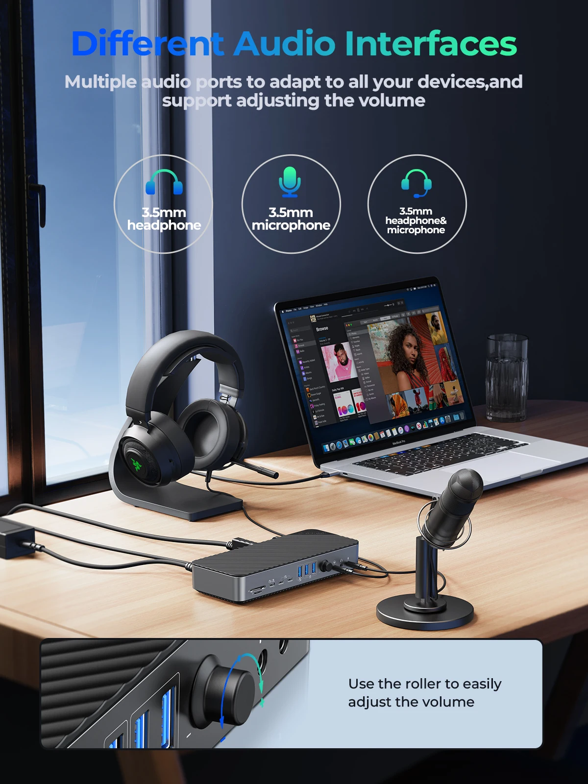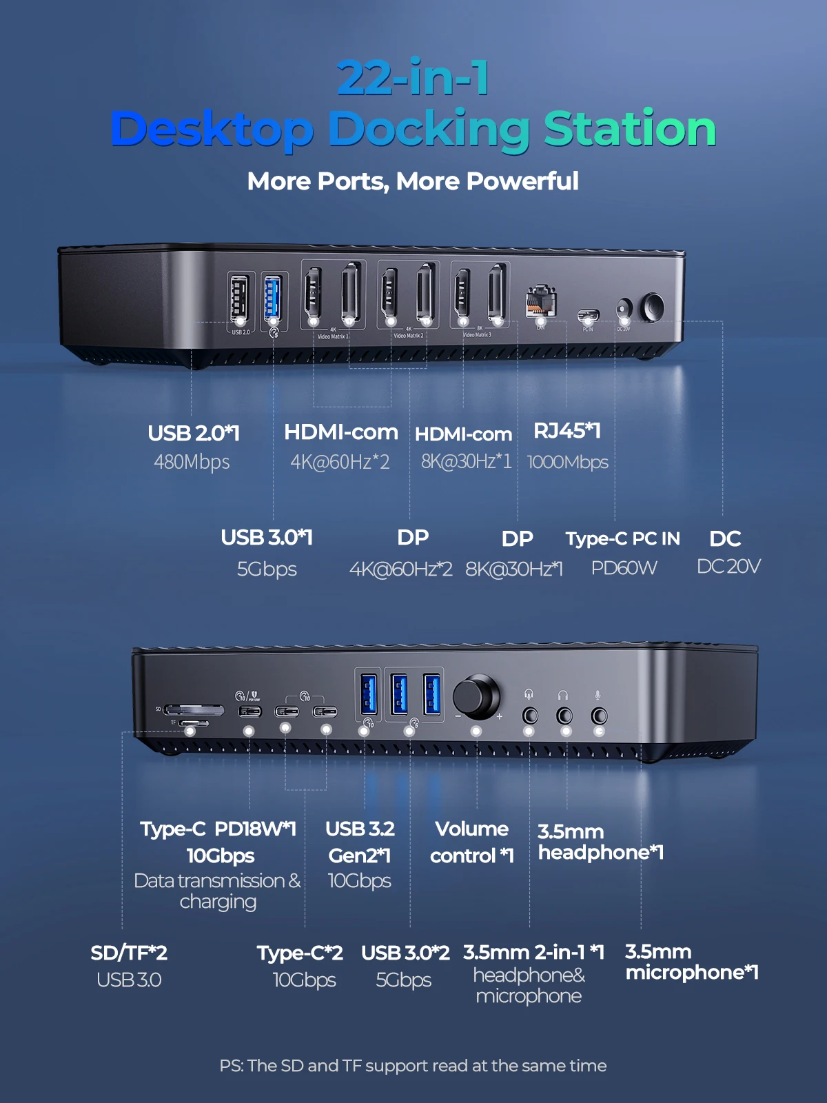 Tipo-C 10Gbps PD18W + Tipo-C 10Gbps * 2 + 10Gbps * 1 + USB2.0 + USB3.0 + RJ45 + SD/TF + HDMI-com 4K @ 60Hz * 2 + HDMI-COM 8K @ 30Hz * 1 + DP4K @ 60Hz * 2 + DP8K @ 30Hz * 1 + 3,5mm auriculares * 1 + 3,5mm micrófono * 1 + 3,5 MM 2 en 1