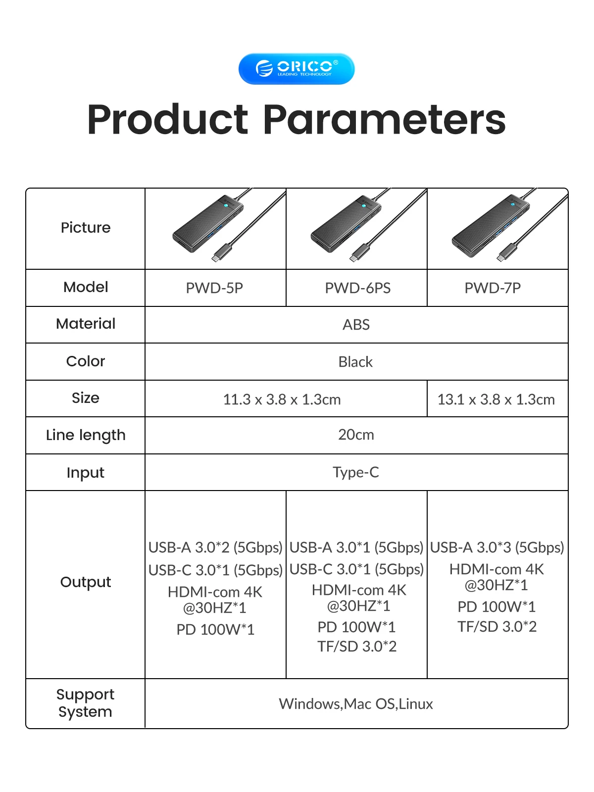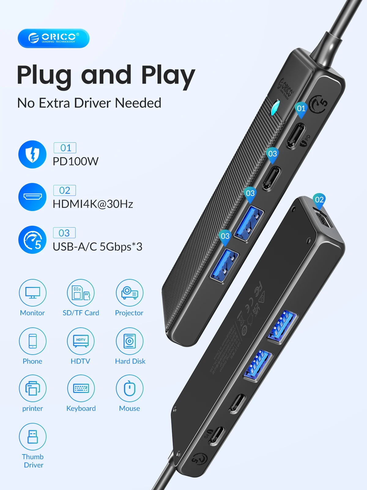 Comprar ORICO-estación de acoplamiento USB tipo C a HDMI com, adaptador USB 3,0, 4K30Hz, PD100W, divisor de lectura de tarjeta para MacBook, iPad Pro, Huawei