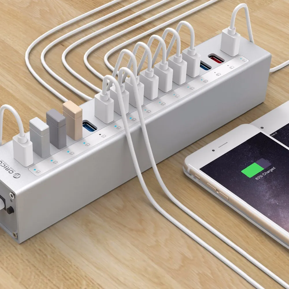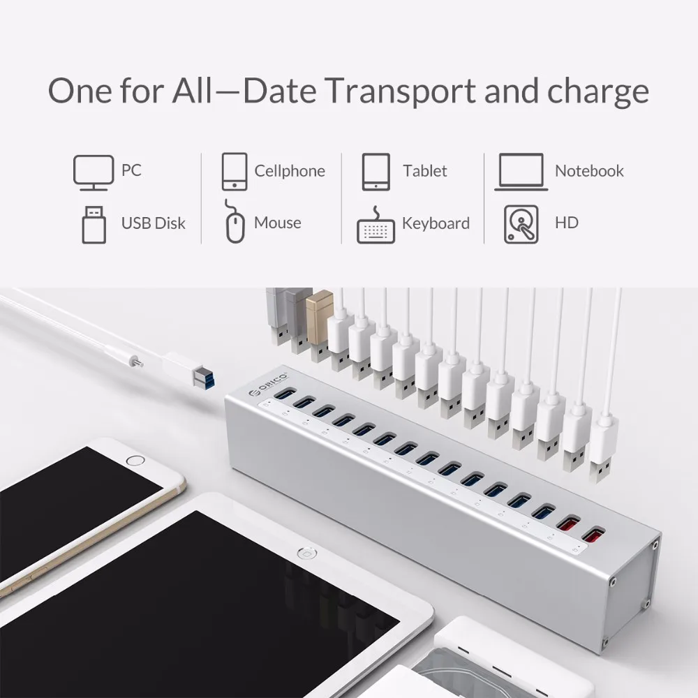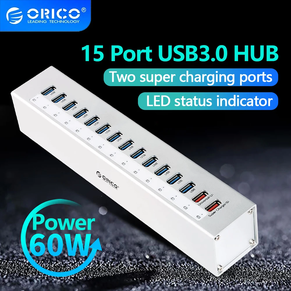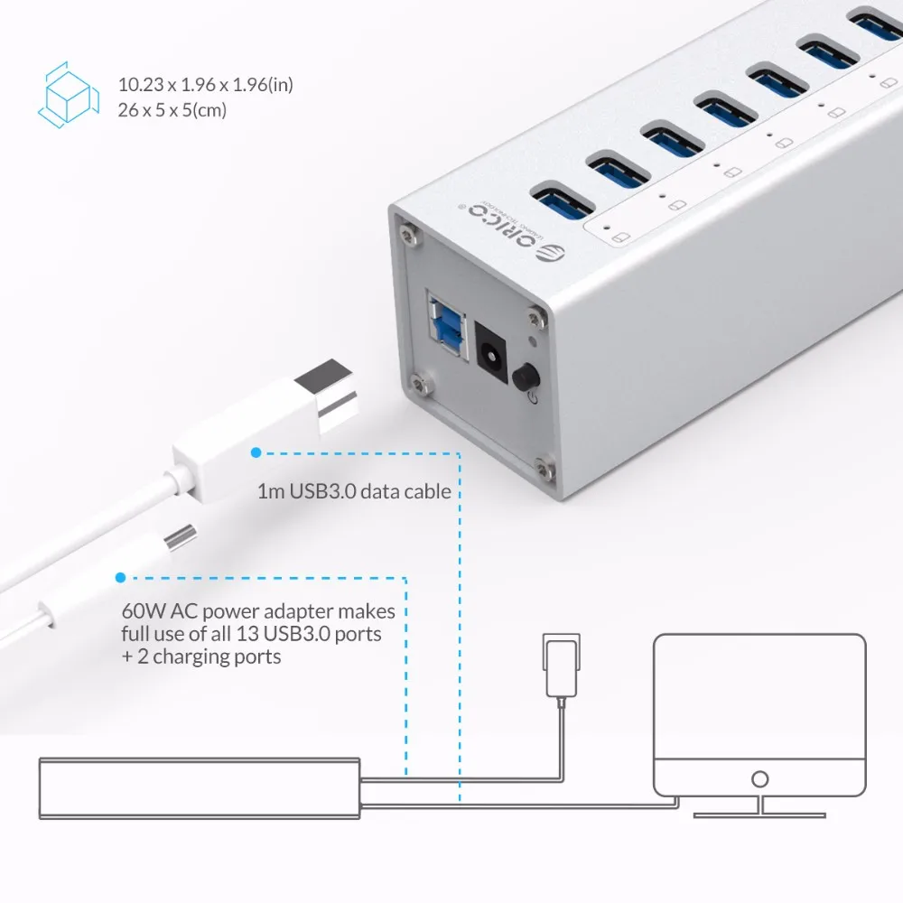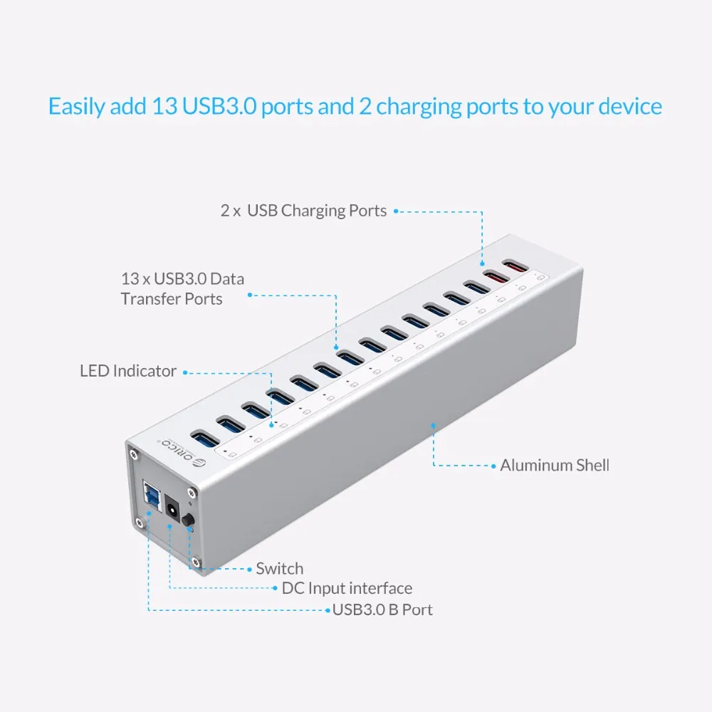 Comprar ORICO-Hub A3H13P2-SV de 13 puertos de aluminio, splitter con puertos de carga de 5V y 2.4A, multi USB3.0, supercargador de 5V y 1A, universal, plata