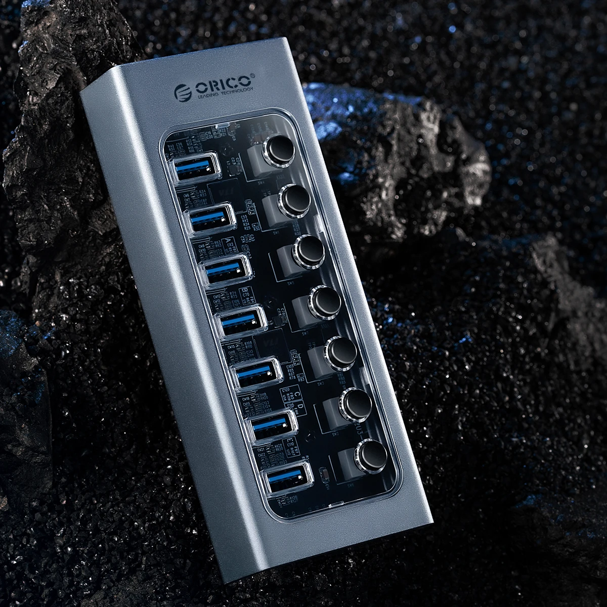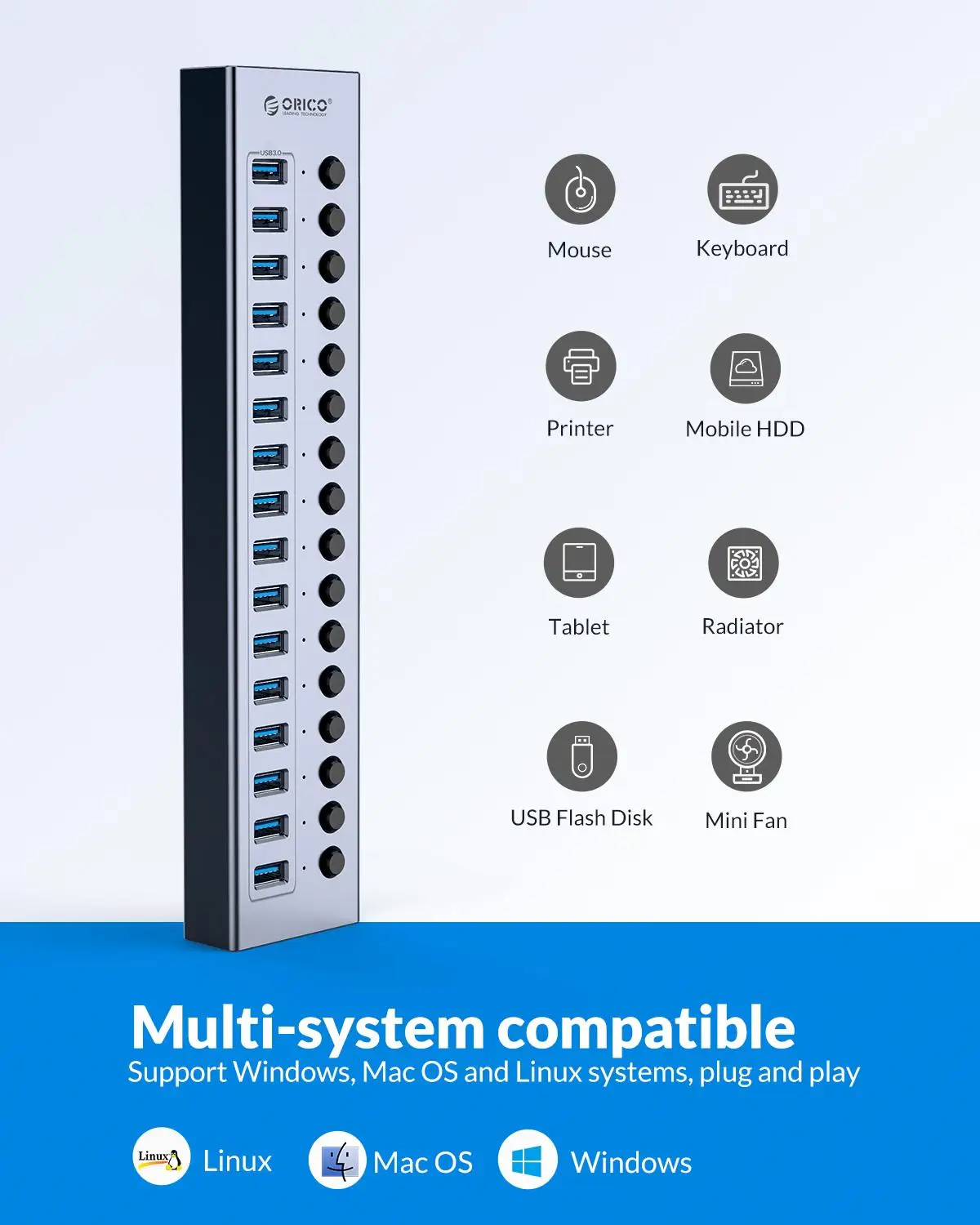 Con orificios y tornillos para colgar en la parte posterior, ¡ahora puede montarlo de forma segura en la pared!Comprar ORICO-HUB con alimentación USB 3,0, 7/10/13/16 puertos, extensión USB con interruptores de encendido/apagado, adaptador de corriente de 12V, compatible con divisor de carga BC1.2