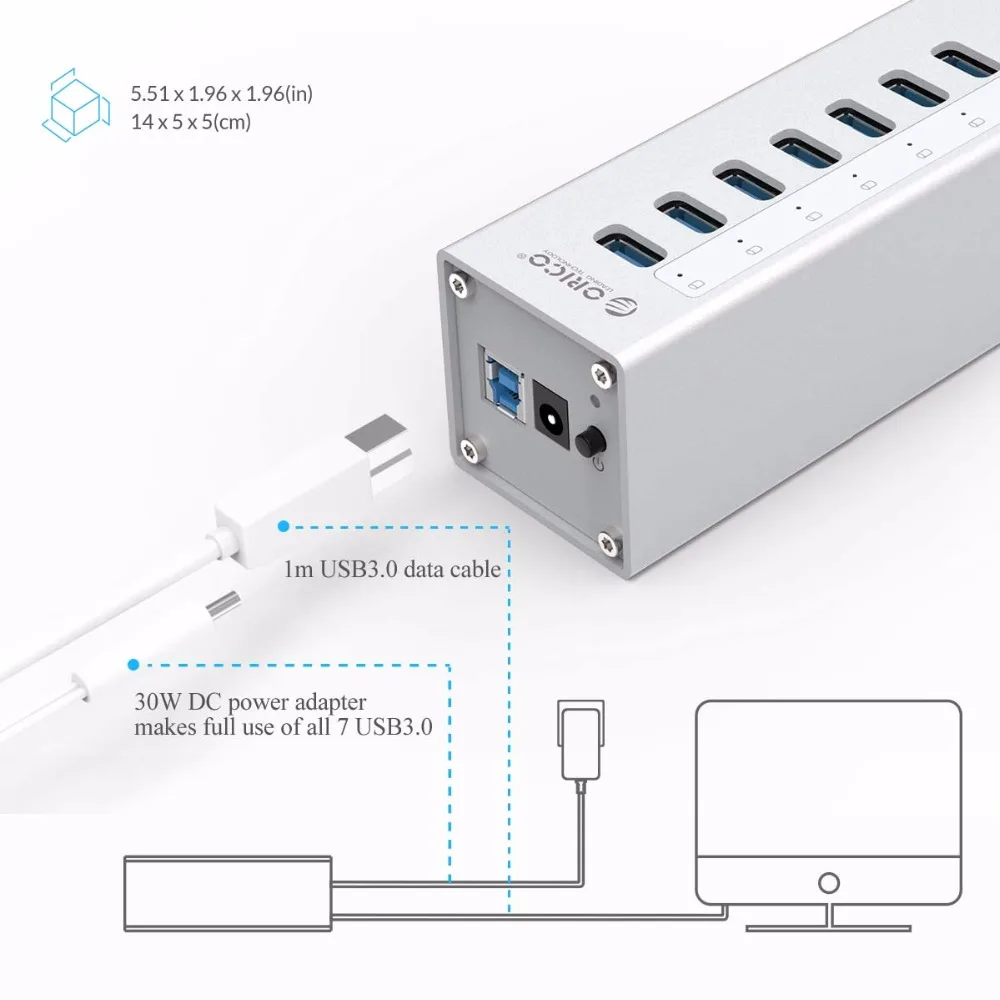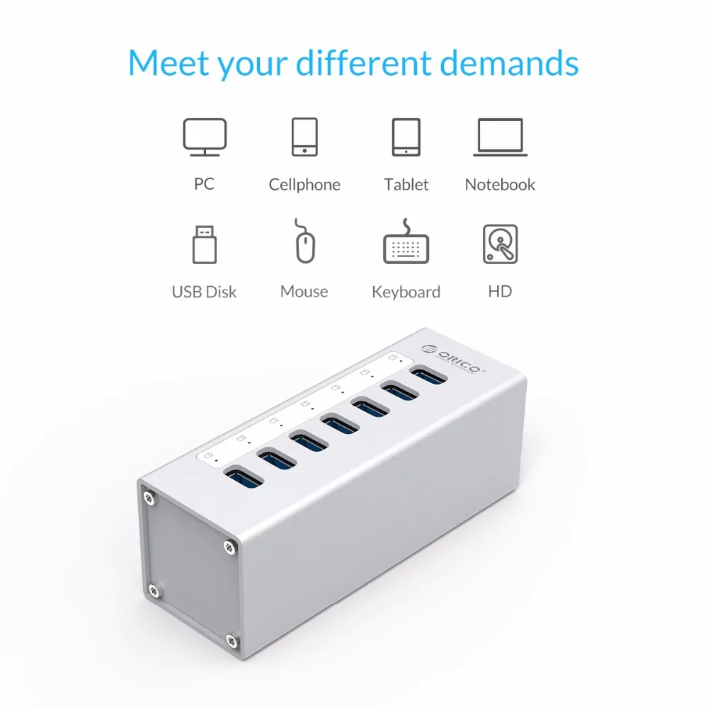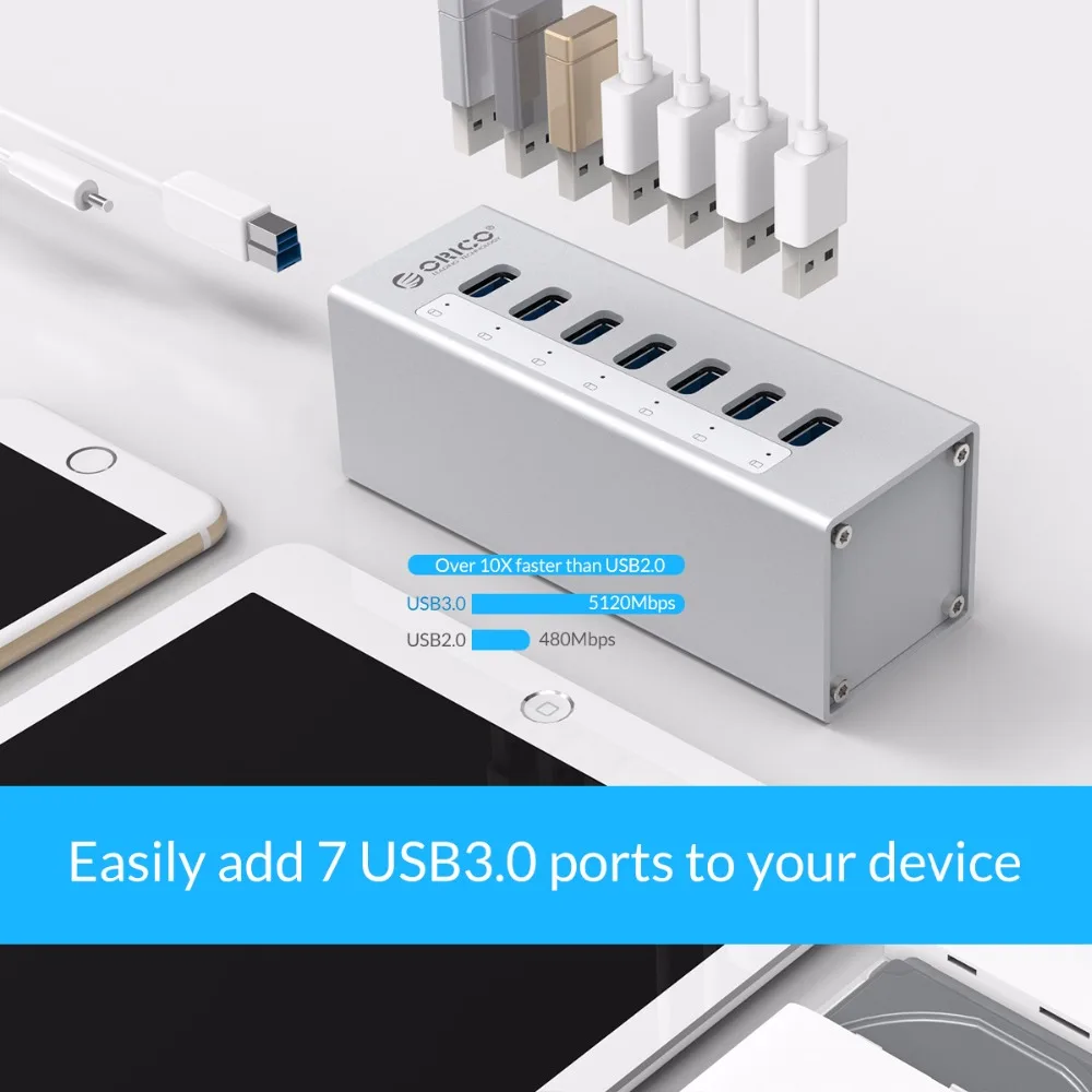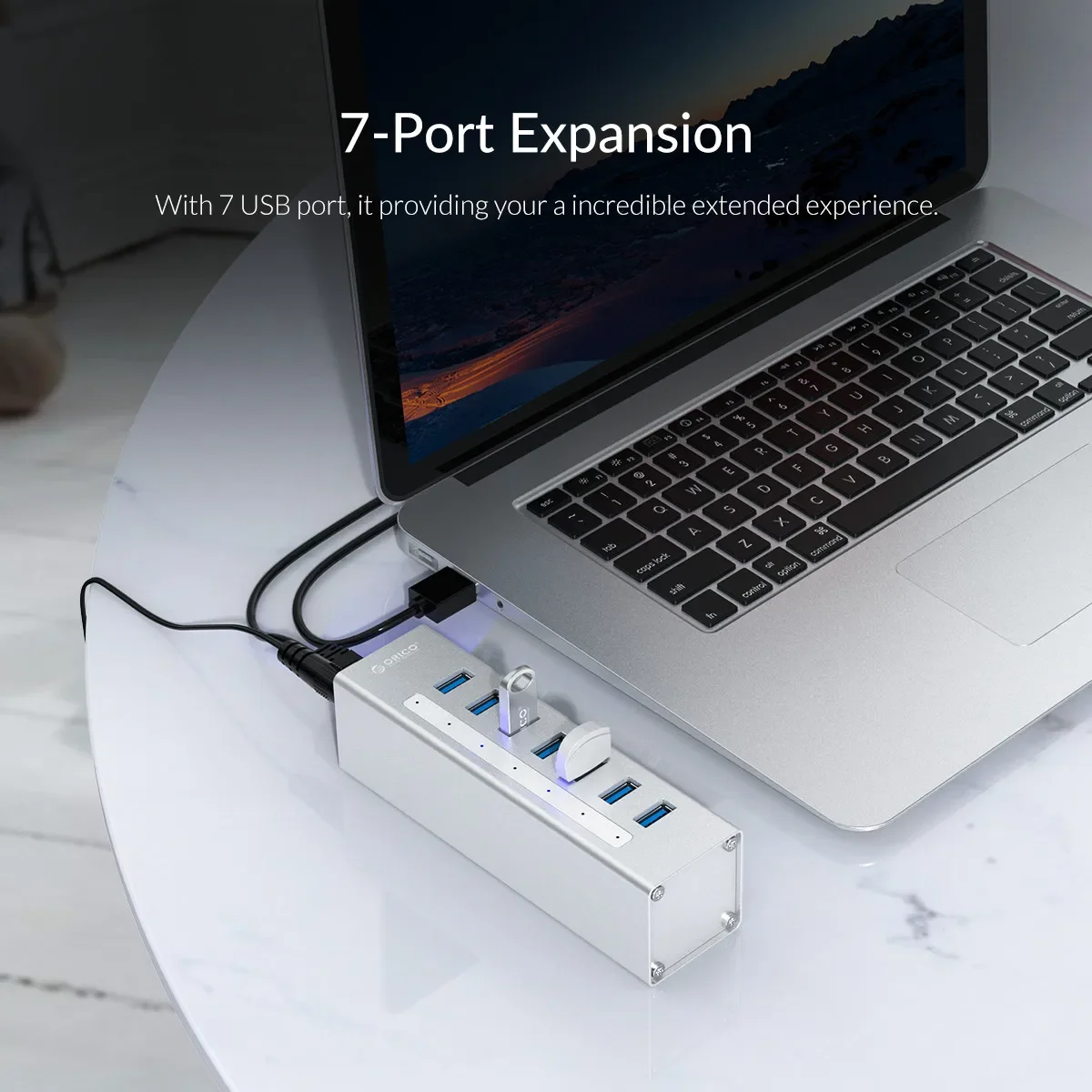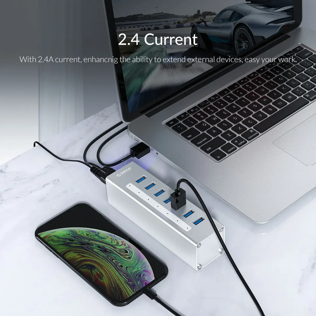 Comprar ORICO-HUB USB 3,0 de aluminio, 5Gbps, 7 puertos, divisor USB 3,0 con adaptador de corriente de 12V, compatible con BC 1,2, divisor de carga para PC y portátil