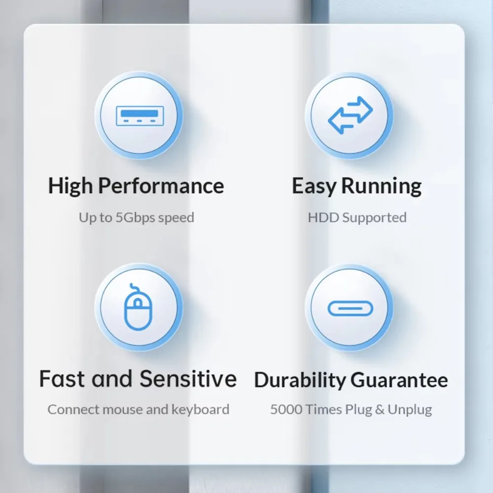 ORICO USB 3.0 Hub transfers data up to 5Gbps, which is 10 times faster than USB 2.0. HD movies can be streamed in seconds. Backward compatible with USB 2.0, 1.1. Simultaneous reading of two 1TB 2.5" SSDs without power. Support OTG function, OTG function needs not only hub support, but also mobile phone support.
