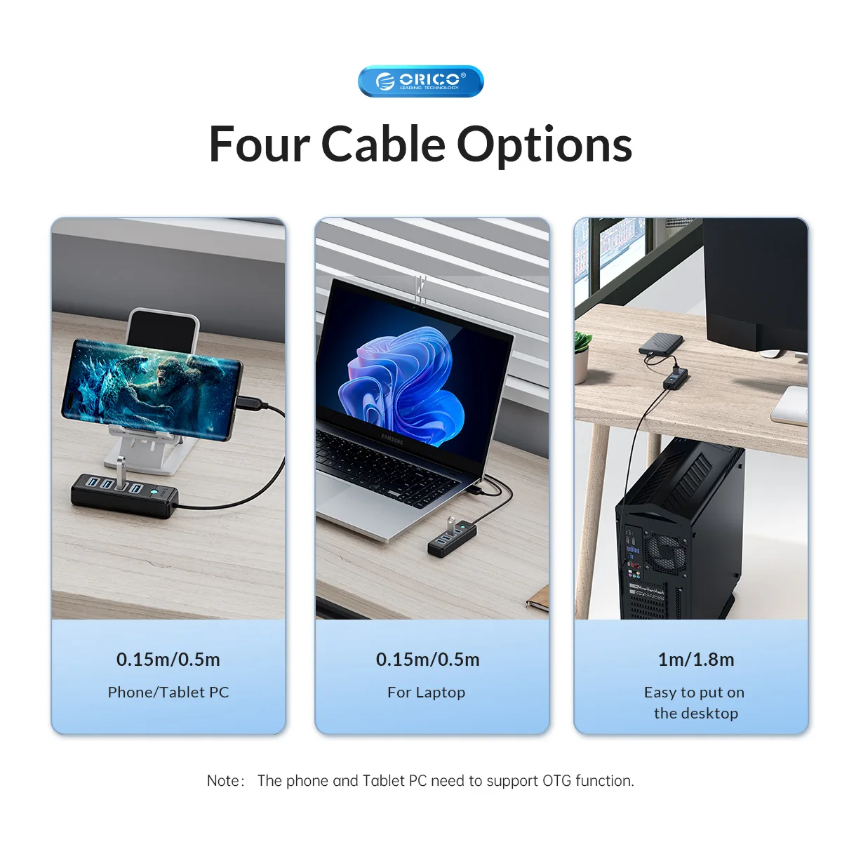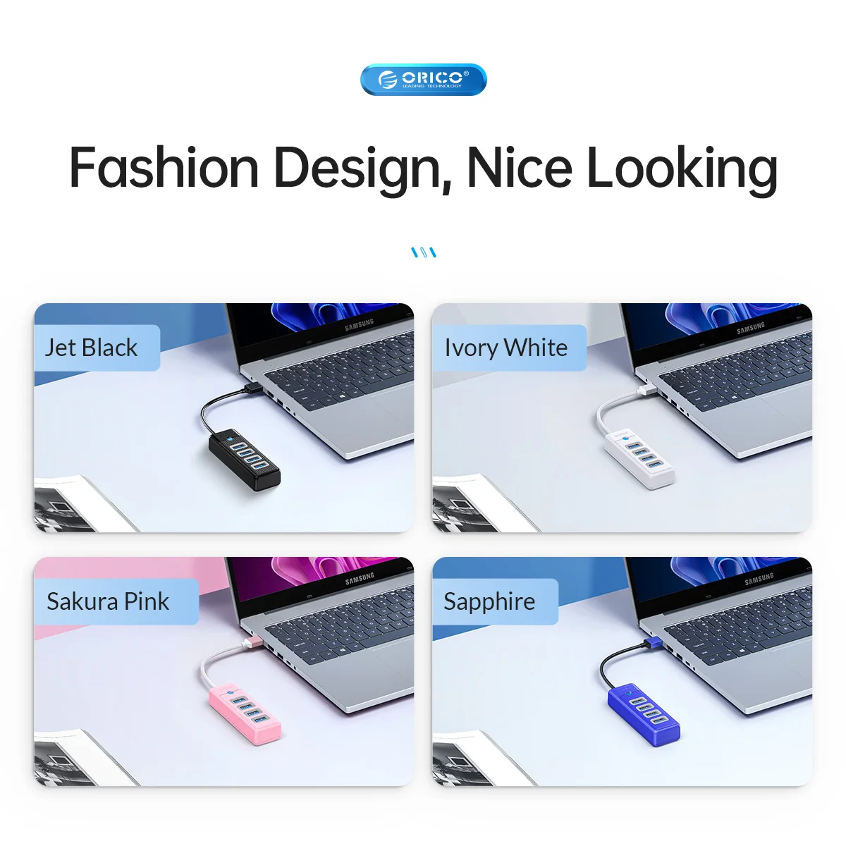 ORICO 4-port USB hub applies to various devices: laptop, pc tower, XBOX, PS4, flash drive, keyboard, mouse, card reader, HDD, cellphone OTG adapter, printer, camera, USB fan and USB cables.