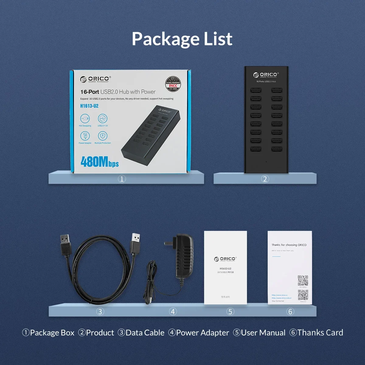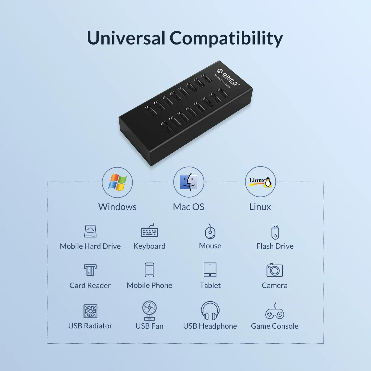 ORICO-Hub USB Industrial de aluminio, divisor USB de 16 puertos, estación de acoplamiento USB con adaptador de corriente de 12V para accesorios de ordenador portátil