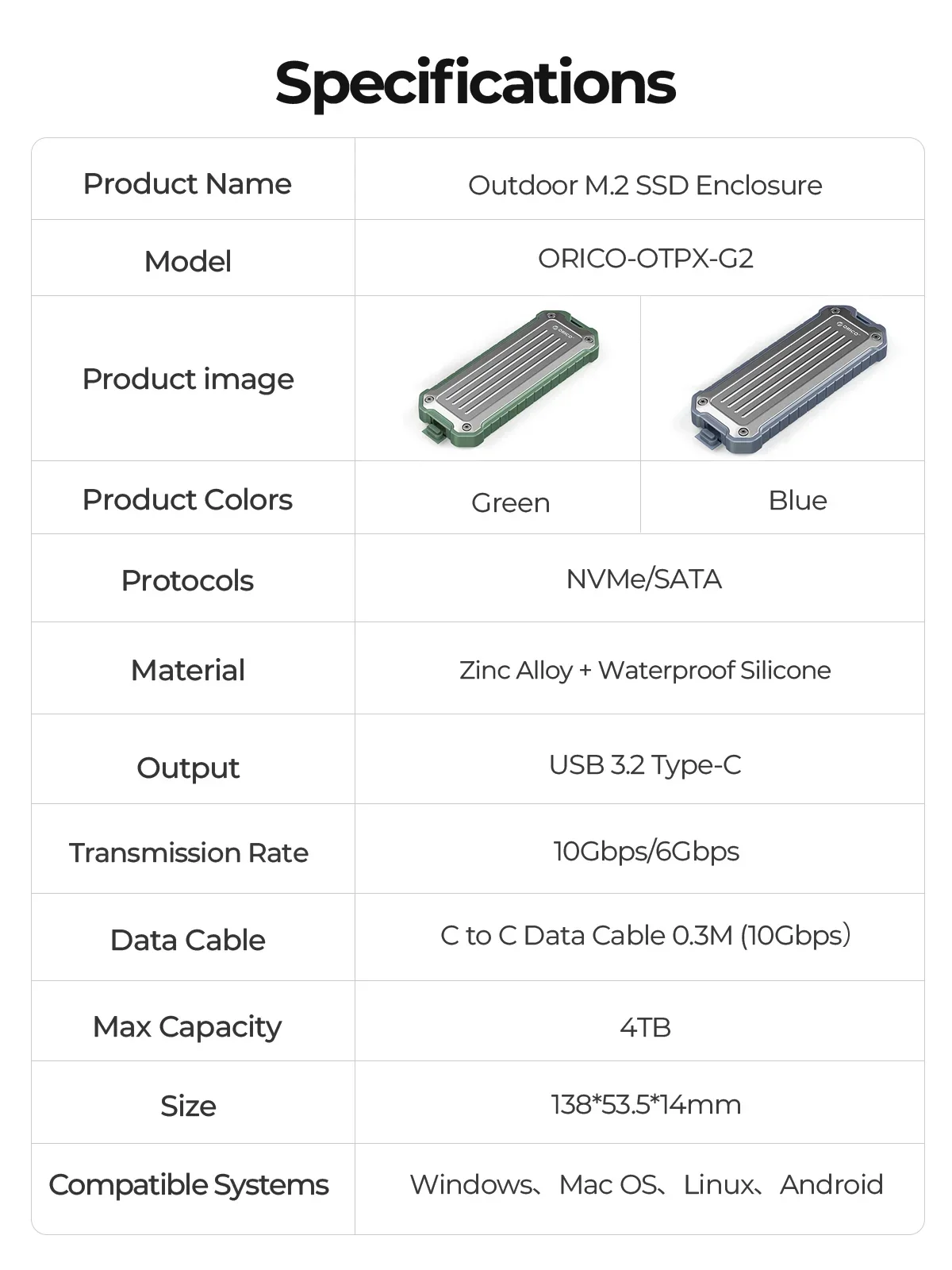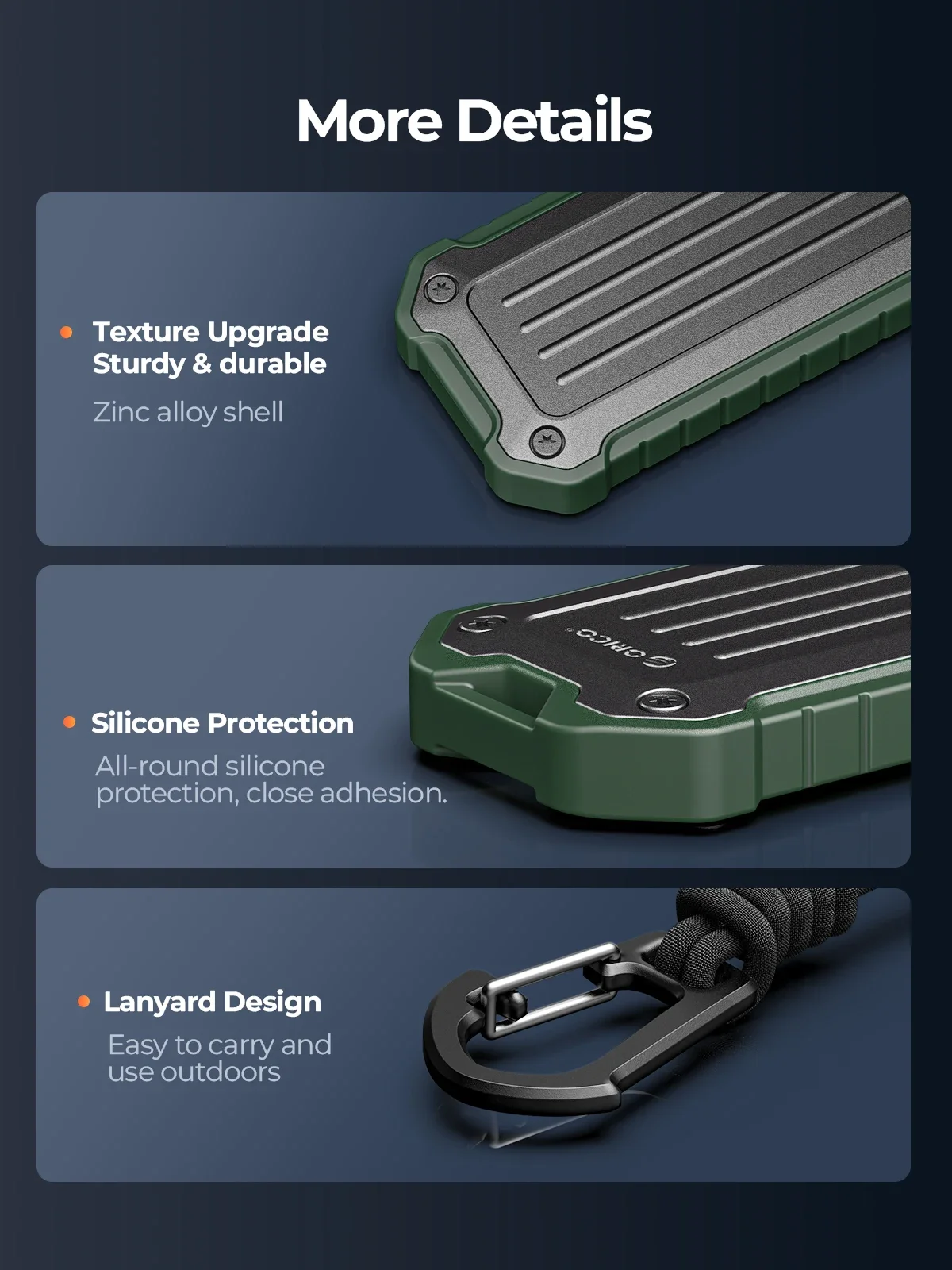 Diseño resistente de aleación de zinc y silicona, resistente al agua, al polvo y a los golpes.Soporte de alta resistencia para proporcionar una protección sólida para SSD. Resistente y duradero.