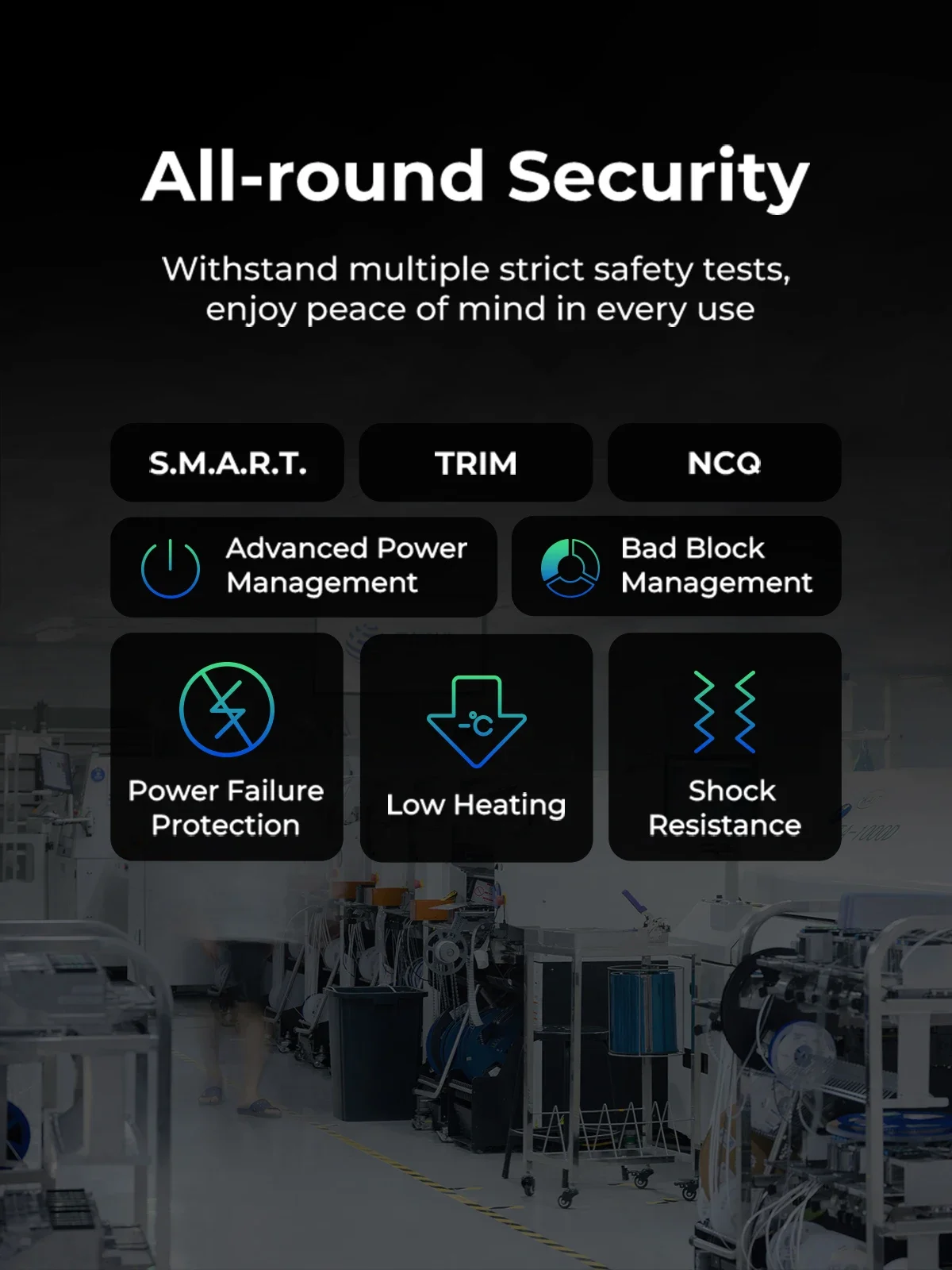 Partículas NAND de alto rendimiento, más espacio disponible para usted.256 GB, 512 GB, 1 TB, 2 TB, 4 TB para selección.