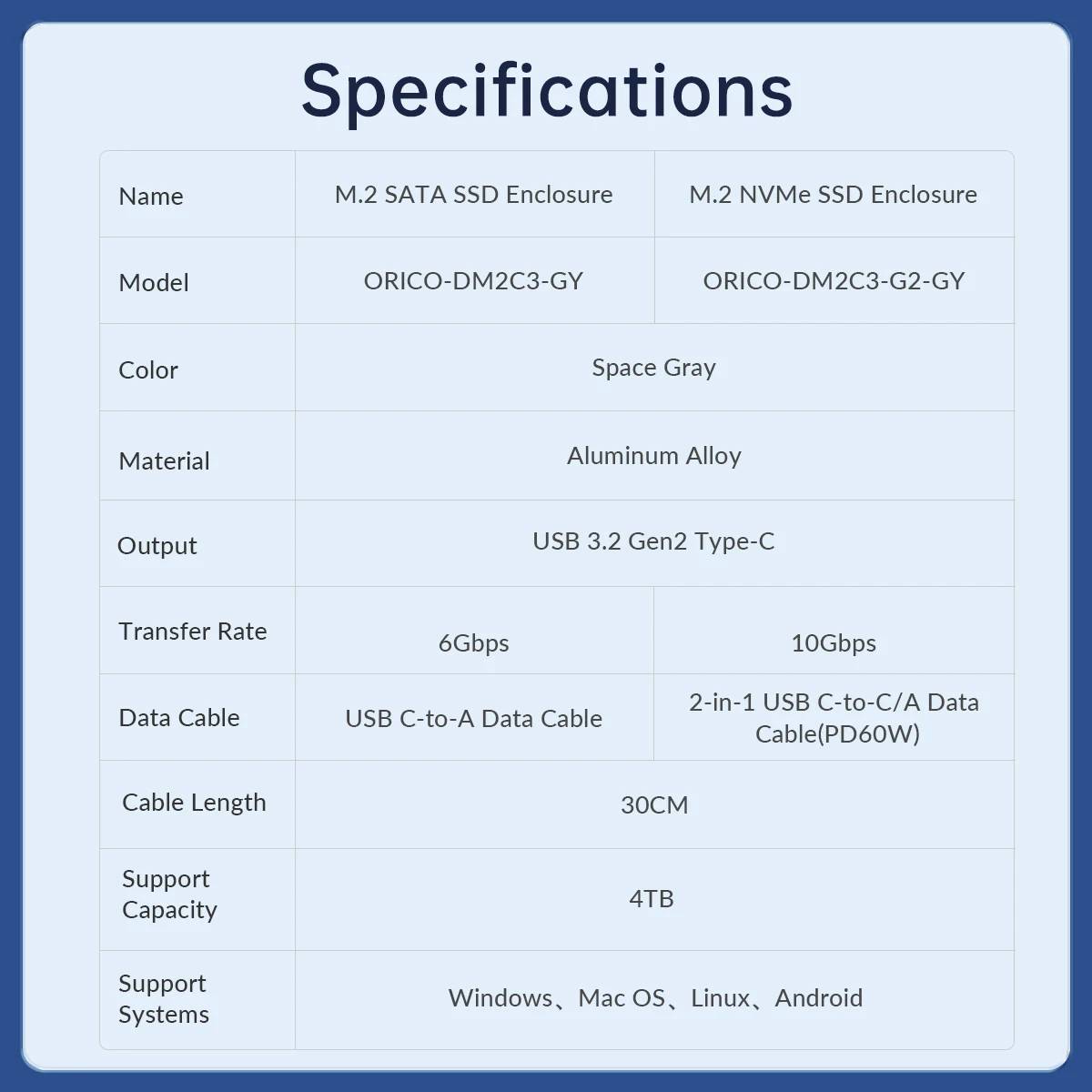 Solo admite NVMe PCI-E protocolo M key/M&B Key SSD, con cable de fecha 2 en 1 C a C/A de 30 cm.