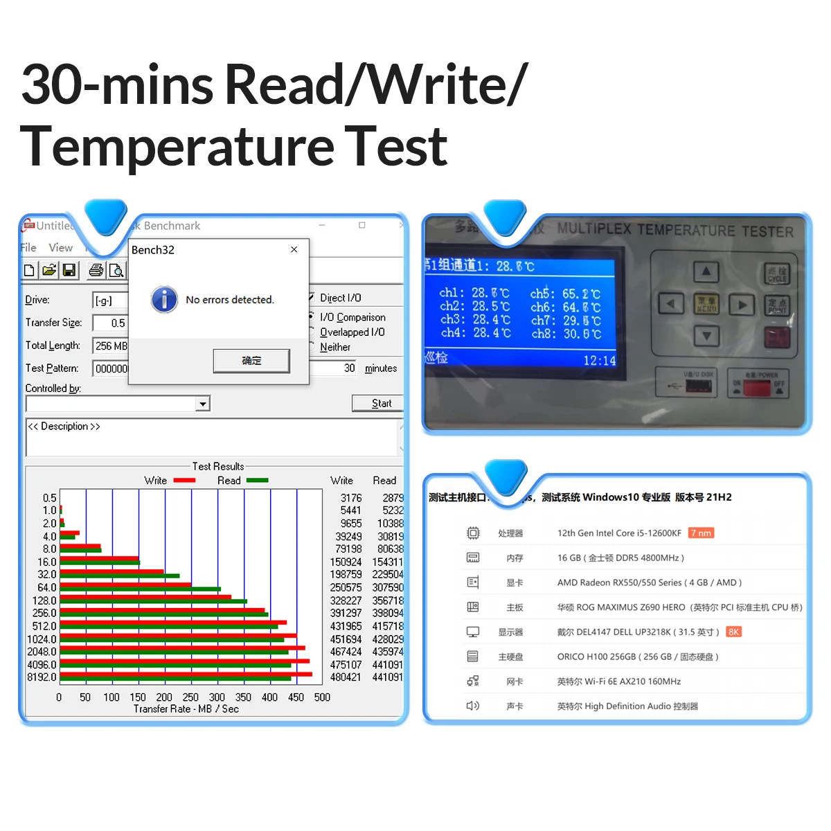 Unidad Flash USSD USB3.2 Gen1 30 minutos lectura continua a toda velocidad en el entorno de prueba del laboratorio ORICO, visualización de temperatura 47,2 °C.
