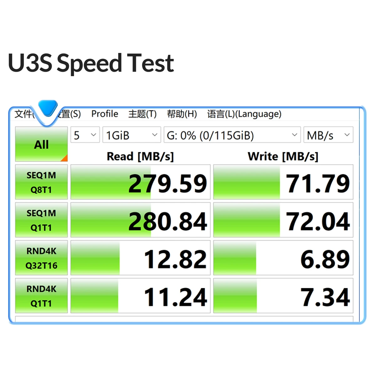 Usando el protocolo de transmisión de alta velocidad USB3.2 Gen1, velocidad de lectura máxima 297 MB/s, velocidad de escritura de hasta 70 MB/s. Las velocidades de escritura de hasta 15 veces más rápidas que las unidades USB 2,0 estándar, puede transferir archivos de 1 GB en menos de 3 segundos.