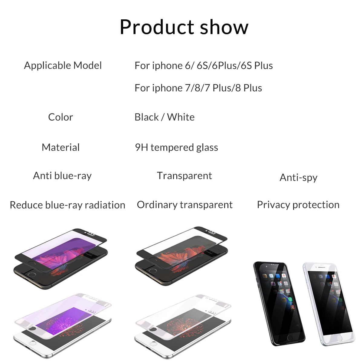 1. Nombre del producto: Película protectora de pantalla de vidrio templado. 2. Material: vidrio templado de dureza 9H. 3. Característica: A. Cobertura de pantalla completa 3D. B. Reduce las huellas dactilares. C. Resistente a roturas y evita manchas. 4. Tipo: A. anti-rayos azules: reduce el daño de los rayos azules en los ojos. B. antiespía: evita las miradas y protege la privacidad. C. Película protectora ordinaria de alta definición.