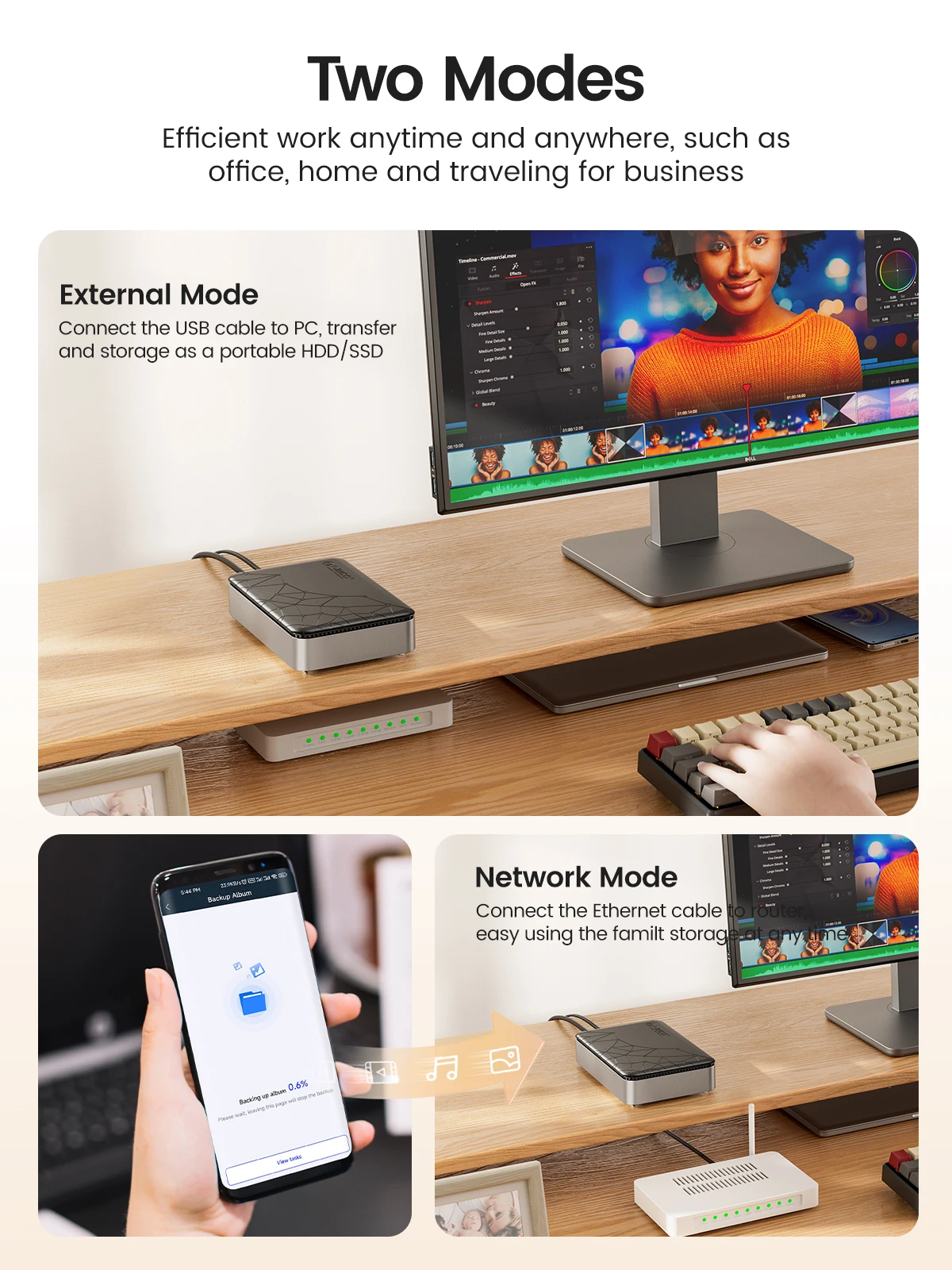 Cambie entre el modo NAS y el modo de disco duro móvil DAS a voluntad.