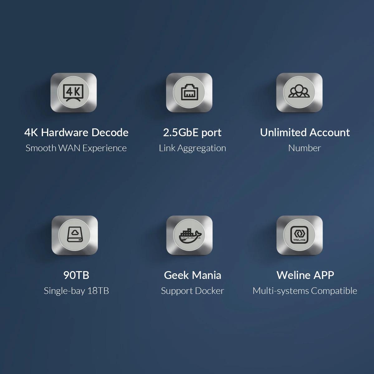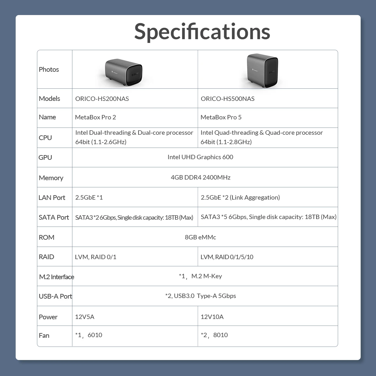 HS500NAS es un NAS de nube privada de familia avanzada, con un diseño de arquitectura de cinco bahías, equipado con Intel Celeron N4120 quad-core, procesador de CPU de 64 bits de cuatro hilos, Memoria grande de 4GB, puertos duales 2.5GbE Gigabit Ethernet, dos interfaces de alta velocidad USB3.0 Tipo-A 5Gbps. Haciendo del ORICO HS500 un candidato ideal para el entretenimiento multimedia en casa y aplicaciones de oficina pequeñas.