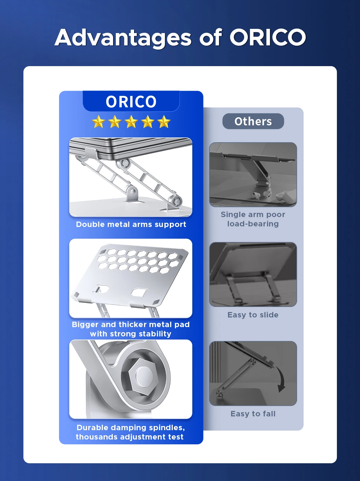 Los soportes para portátiles ORICO suelen estar hechos de aleación de aluminio de alta calidad, un material que no solo es liviano sino también resistente y duradero.La aleación de aluminio también tiene buenas propiedades de disipación de calor, lo que ayuda a mantener la computadora portátil a una temperatura de funcionamiento más baja.