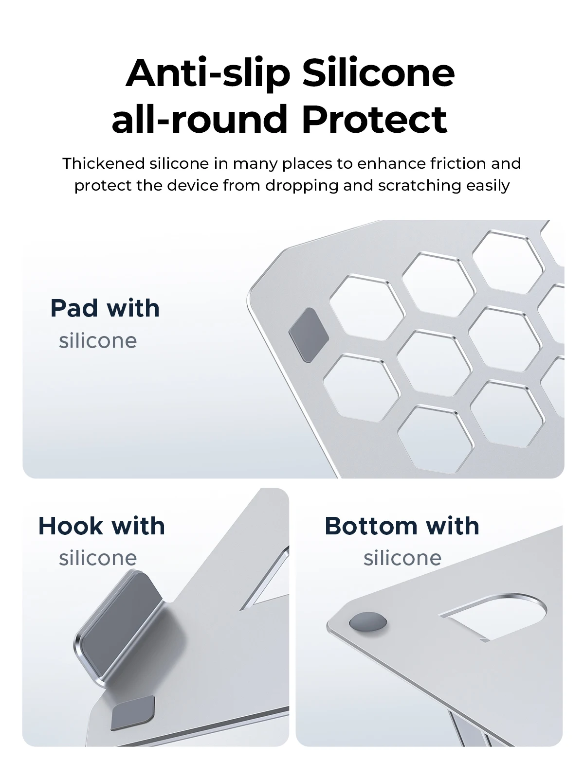 Las partes del soporte para computadora portátil que entran en contacto con la computadora portátil están cubiertas con una capa protectora de silicona suave.Esta característica evita rayones en la computadora portátil al ajustar su ángulo o altura, al mismo tiempo que aumenta la fricción para garantizar que la computadora portátil permanezca segura en su lugar.Esto permite a los jugadores sumergirse en sus juegos sin preocupaciones.