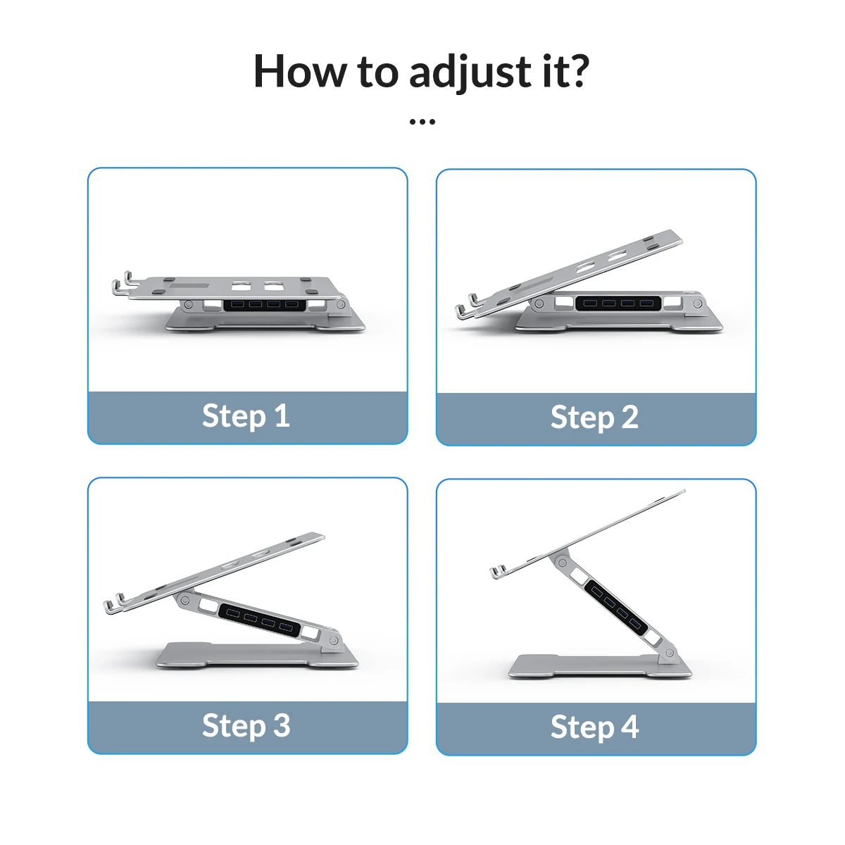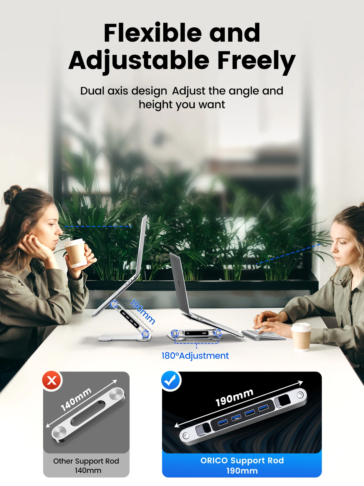 El soporte USB para portátil es bueno para una altura ideal para escribir, ver y sentarse correctamente. Puede inclinar la computadora portátil para una máxima comodidad visual, ideal para la configuración del escritorio. DISEÑO DE DOBLE EJE Ajuste el ángulo y la altura que desee.