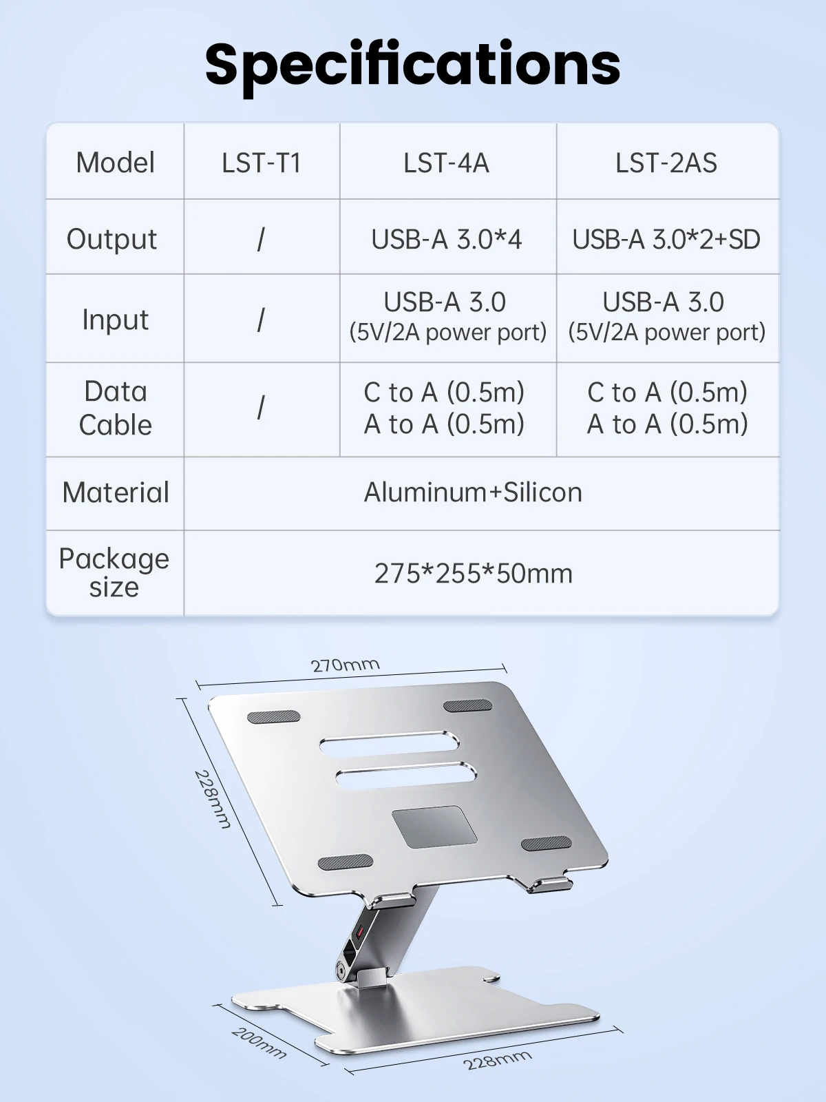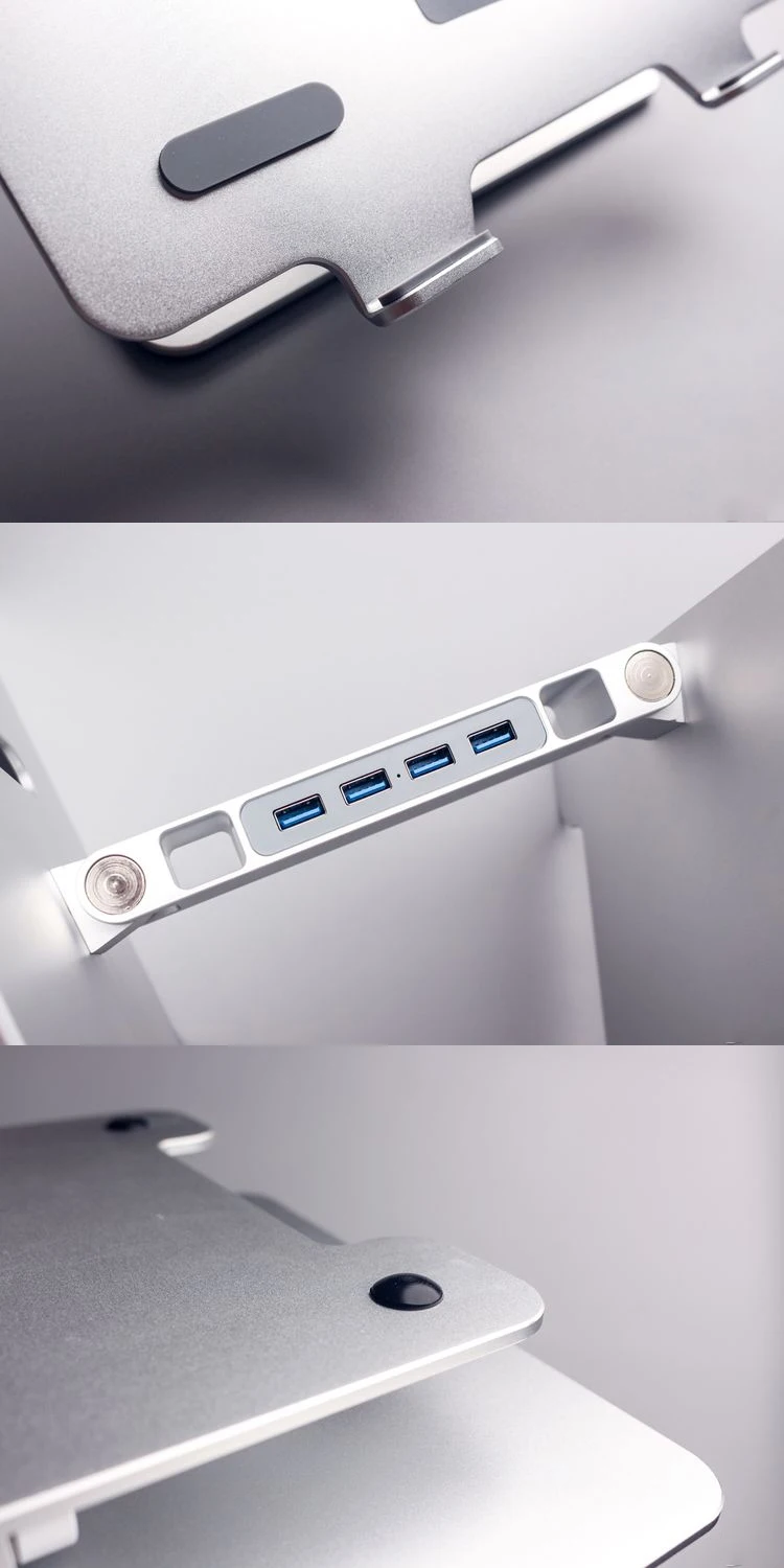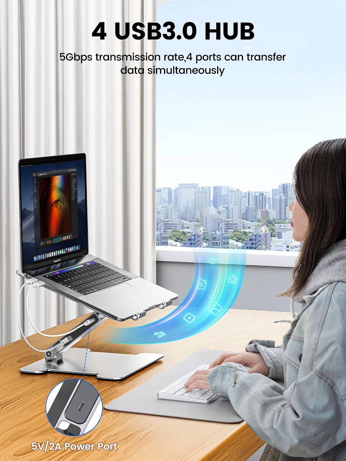 Este soporte para portátil tiene 3 versiones, 2 de las cuales tienen funciones de concentrador. Una versión es que admite la expansión de 4 puertos USB3.0, expanda múltiples dispositivos al mismo tiempo, sin enchufar y desenchufar repetidamente. e interfaz USB3.0, velocidad de transmisión de 5Gbps, Proporciona una experiencia de alta velocidad. Y otra versión viene con dos interfaces USB 3,0 y ranuras para tarjetas compatibles con SD, puede transmitir y acceder a archivos de manera eficiente.(Elija cuidadosamente cuando compre)