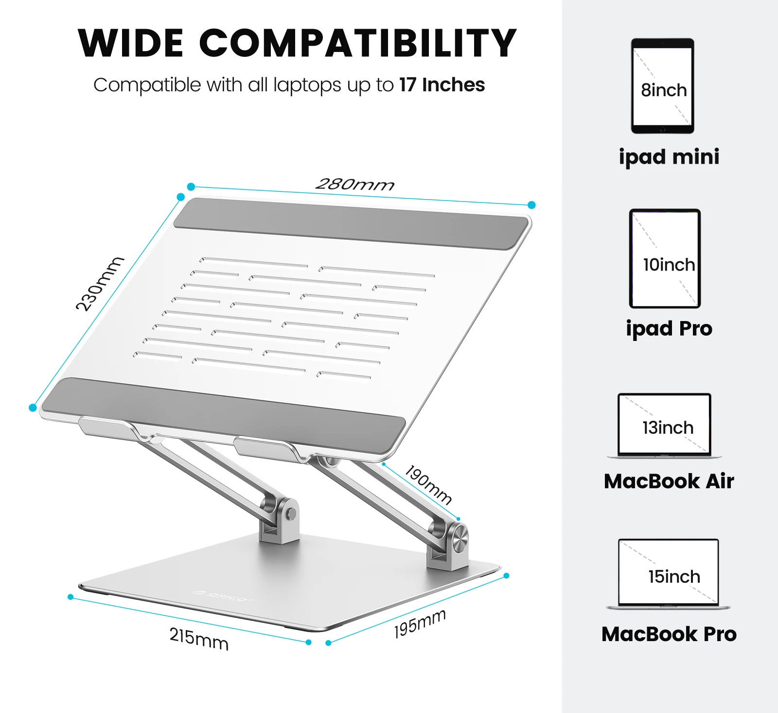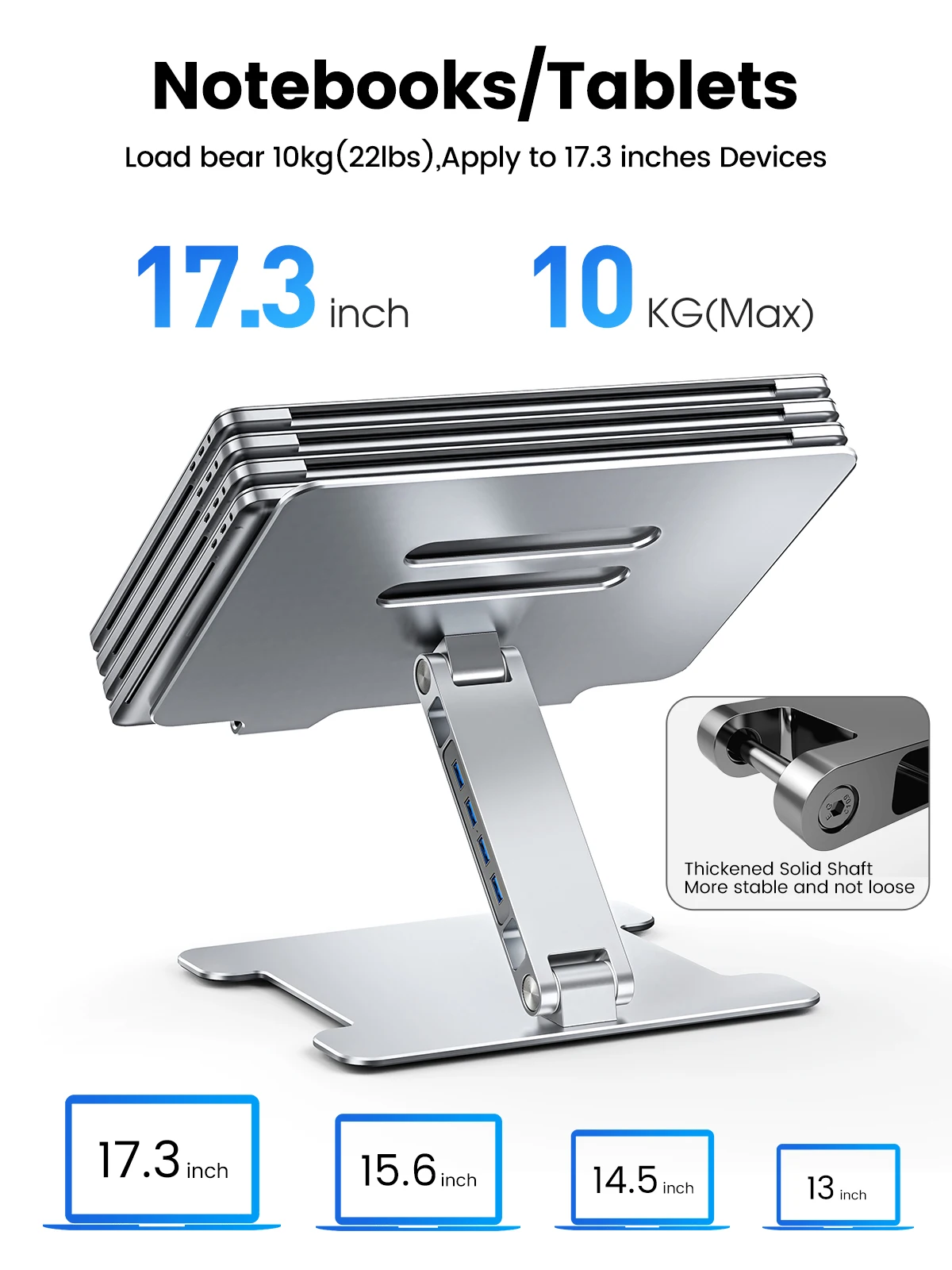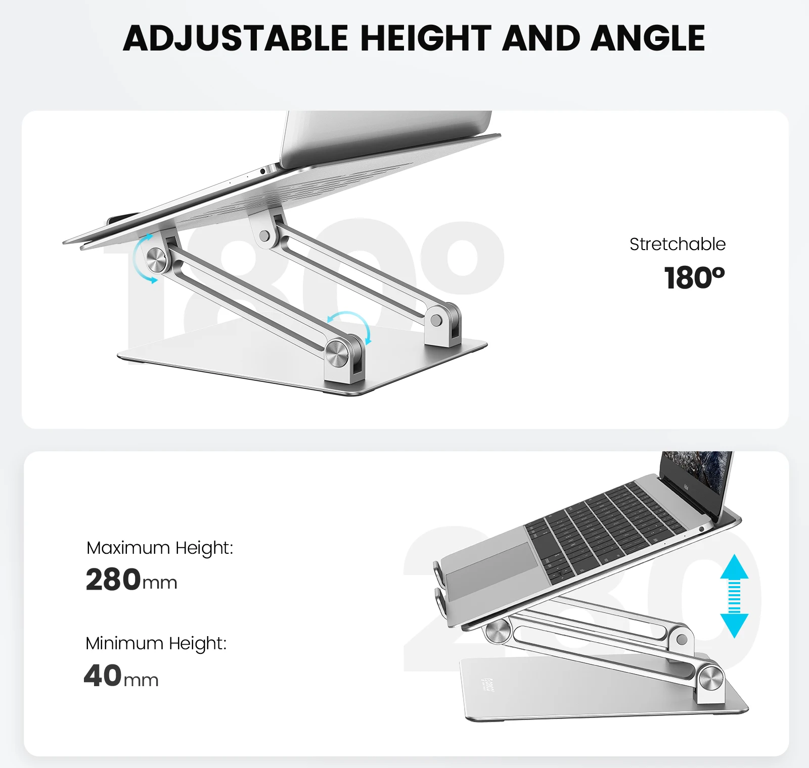 Está hecho de aleación de aluminio de calidad, resistente, estable y resistente, soporta hasta 10kg, pero no se preocupe por ningún bamboleo. El soporte para portátil se adapta a todos los portátiles de 10 a 17,3 pulgadas y es compatible con Windows, Mac Os, Linux. Plug and Play.