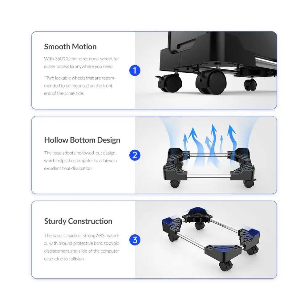 * Sturdy Construction,The base is made of strong ABS material,with around protective bars,to avoid displacement and side of the computer cases due to collision
