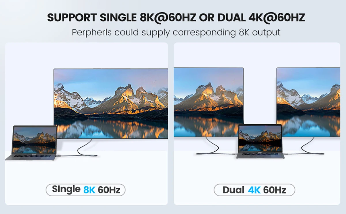 4. Soporta hastaSolo 8K @ 60Hz o doble 4K x 2K @ 60HzResoluciones de vídeo en la pantalla externa.