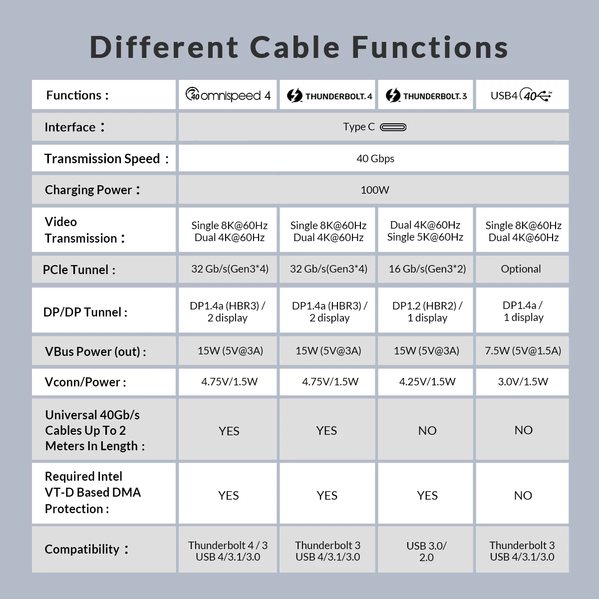 R: Físicamente, ambas son interfaces tipo C y admiten una velocidad de transmisión de 40Gbps y una potencia de salida de 100W, que difieren principalmente en la resolución de transmisión de video y la transmisión de datos PCle.