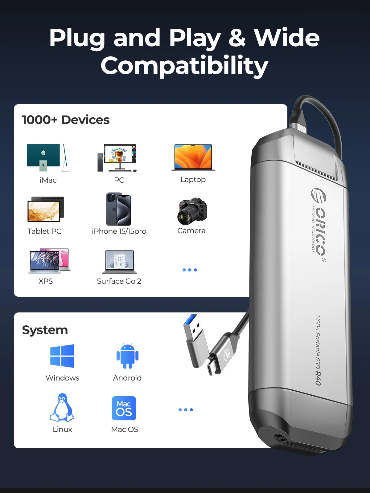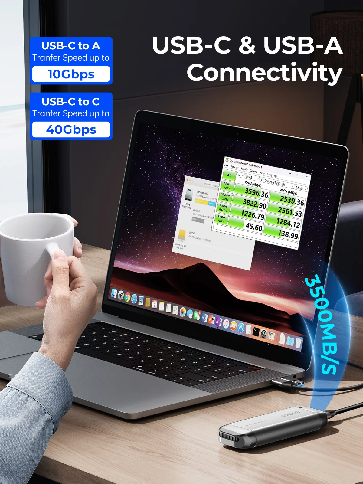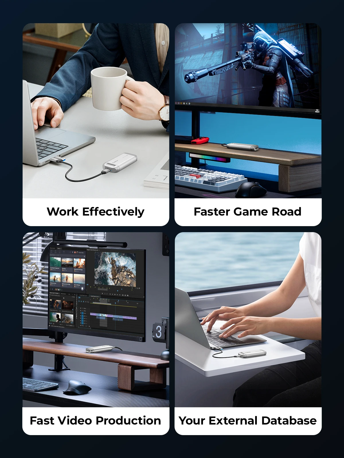 La velocidad de escritura/lectura puede funcionar hasta 3500 MB/s alimentada por adelantado. Interfaz de salida, compatible con PLUG y PLAY, protocolo de aceleración UASP. Está equipado con un cable de datos USB C a USB A y USB C dos en uno, que es adecuado para su uso en el lado del host de diferentes interfaces.