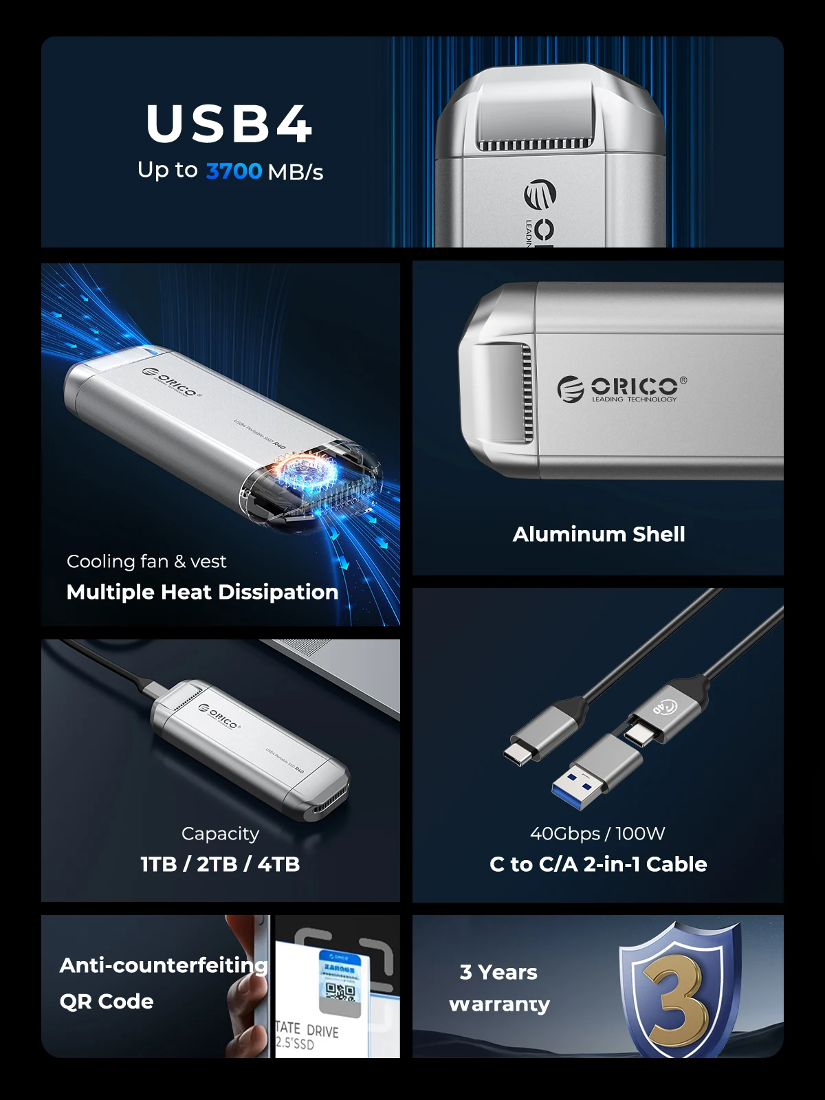 Comprar ORICO-unidad externa de estado sólido Silverstone, SSD portátil de 3500 MB/s, 4TB, 2TB, 1TB, tipo C, aleación de aluminio, PSSD integrado, ventilador de refrigeración