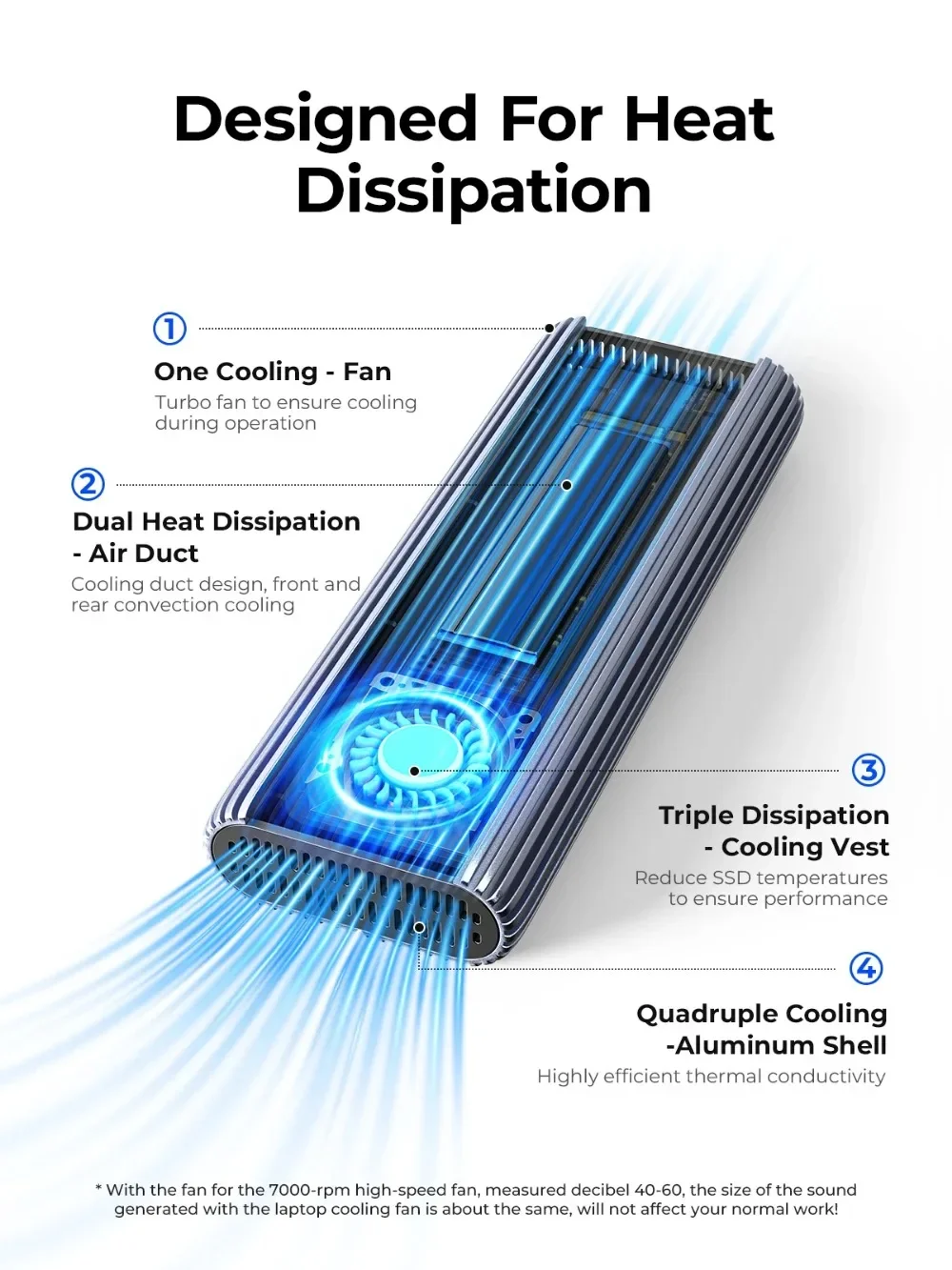 Equipado con un ventilador de refrigeración incorporado, exquisitos conductos de refrigeración y un diseño de refrigeración de carcasa de aleación de aluminio, garantiza que el SSD siempre pueda mantenerse fresco incluso durante un funcionamiento de alto rendimiento sin problemas de sobrecalentamiento.