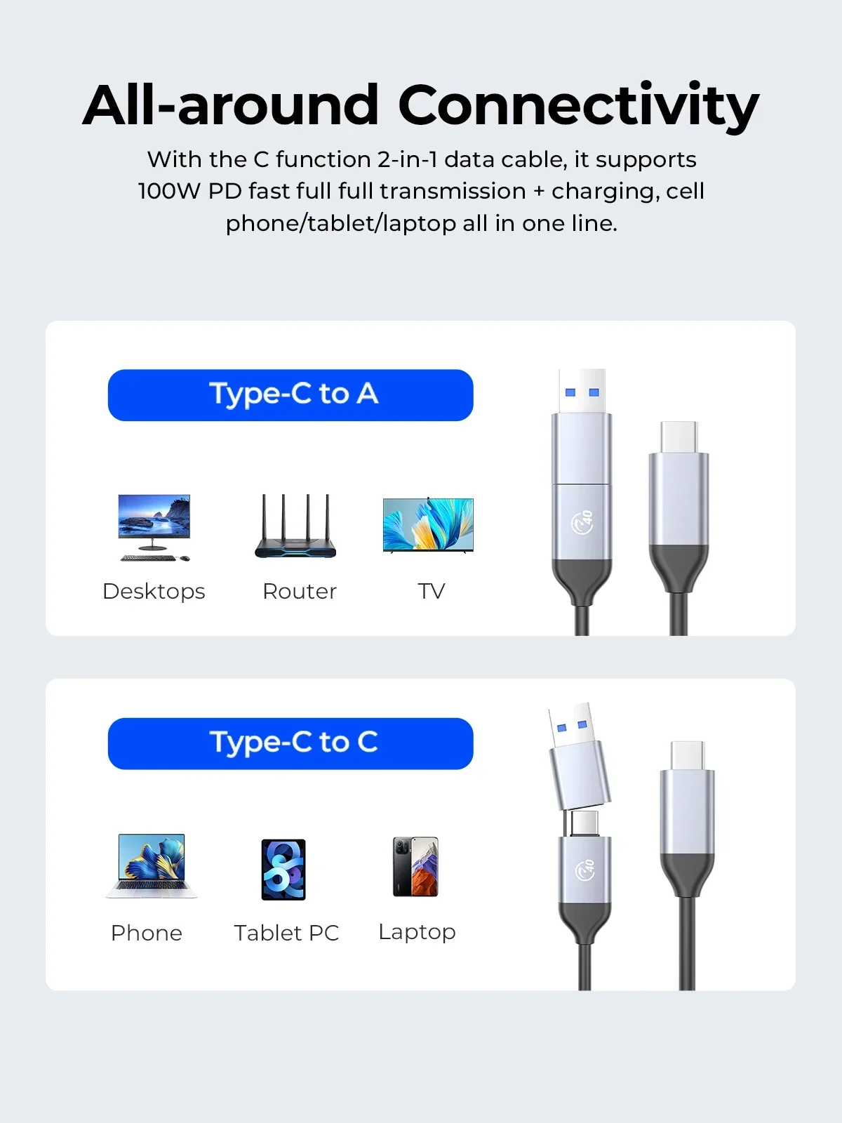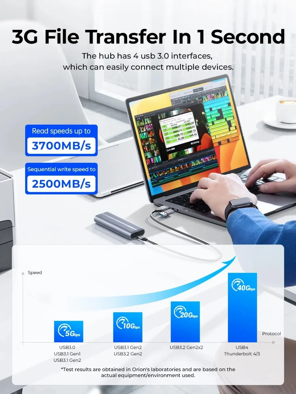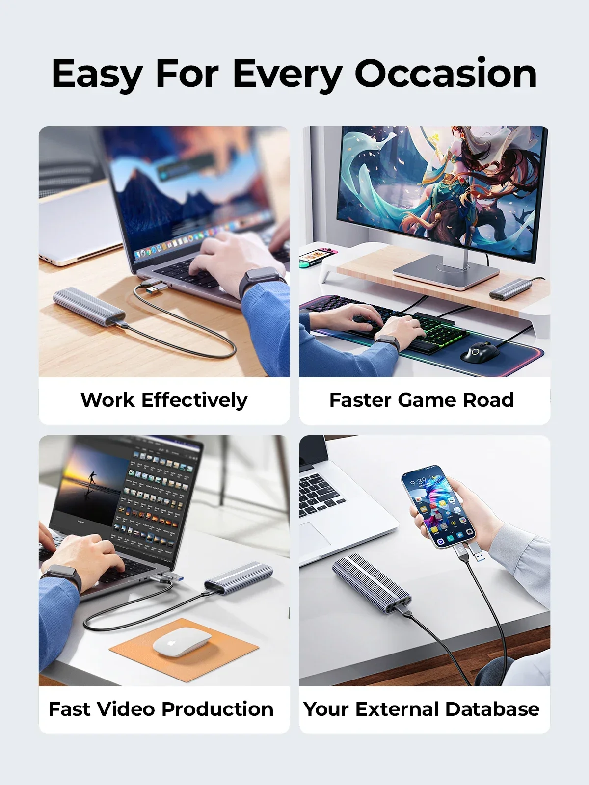 La velocidad de escritura/lectura puede funcionar hasta 3700 MB/s alimentada por adelantado. Interfaz de salida, compatible con PLUG y PLAY, protocolo de aceleración UASP. Está equipado con un cable de datos USB C a USB A y USB C dos en uno, que es adecuado para su uso en el lado del host de diferentes interfaces.