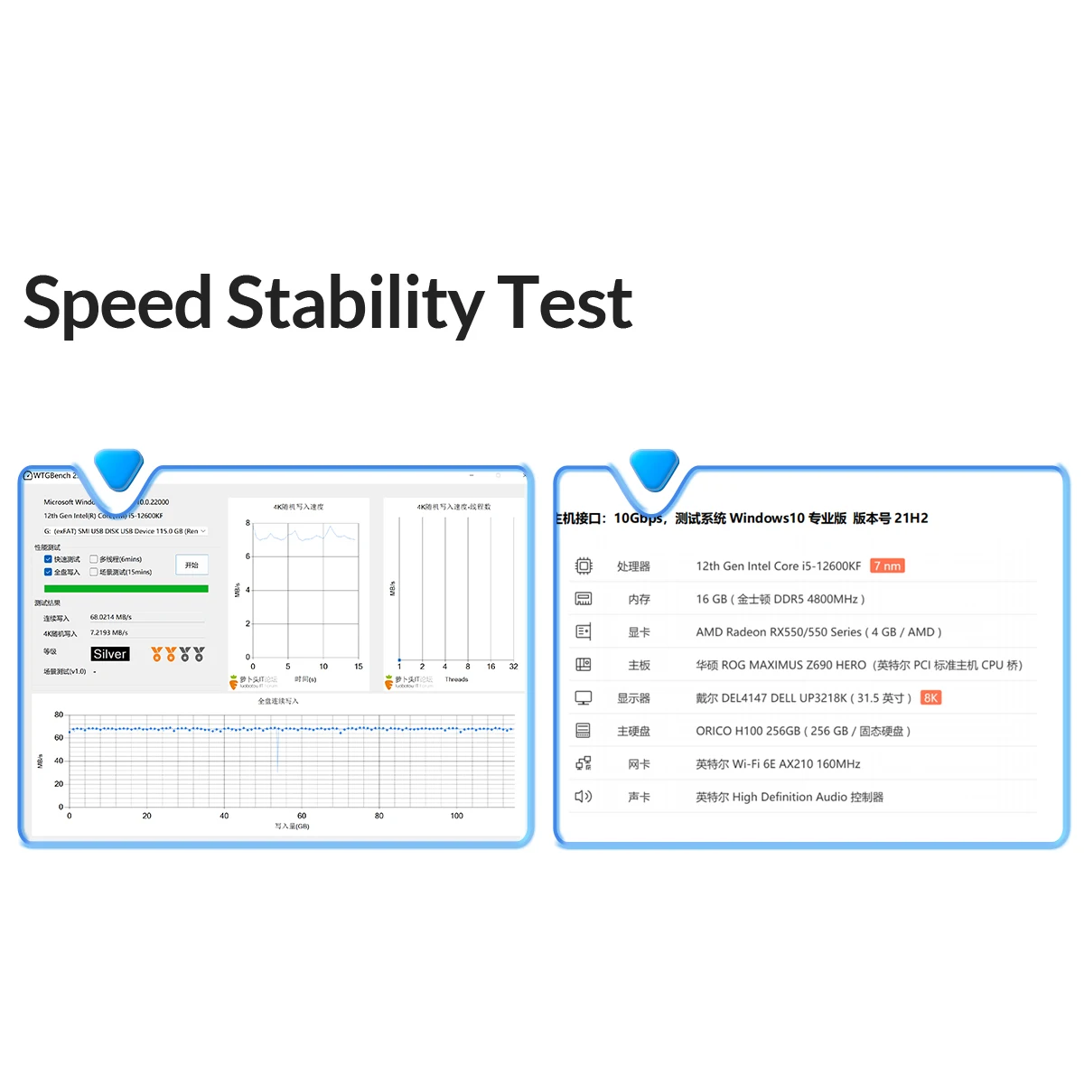 La unidad Flash USB3.2 Gen1 lee un archivo de 60GB en el entorno de prueba del laboratorio ORICO, la velocidad de transmisión es estable.