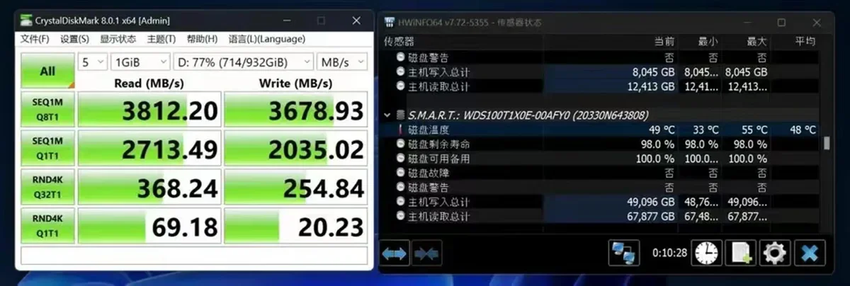 Con una interfaz de salida USB4 Tipo C, admite una velocidad máxima de transmisión de hasta 40 Gbps.La velocidad máxima de lectura continua medida puede alcanzar los 3700 MB/s y la escritura continua puede alcanzar los 3100 MB/s.(Elija SSD O7000.NOTA: La velocidad se verá afectada por el rendimiento de la pantalla y la computadora)