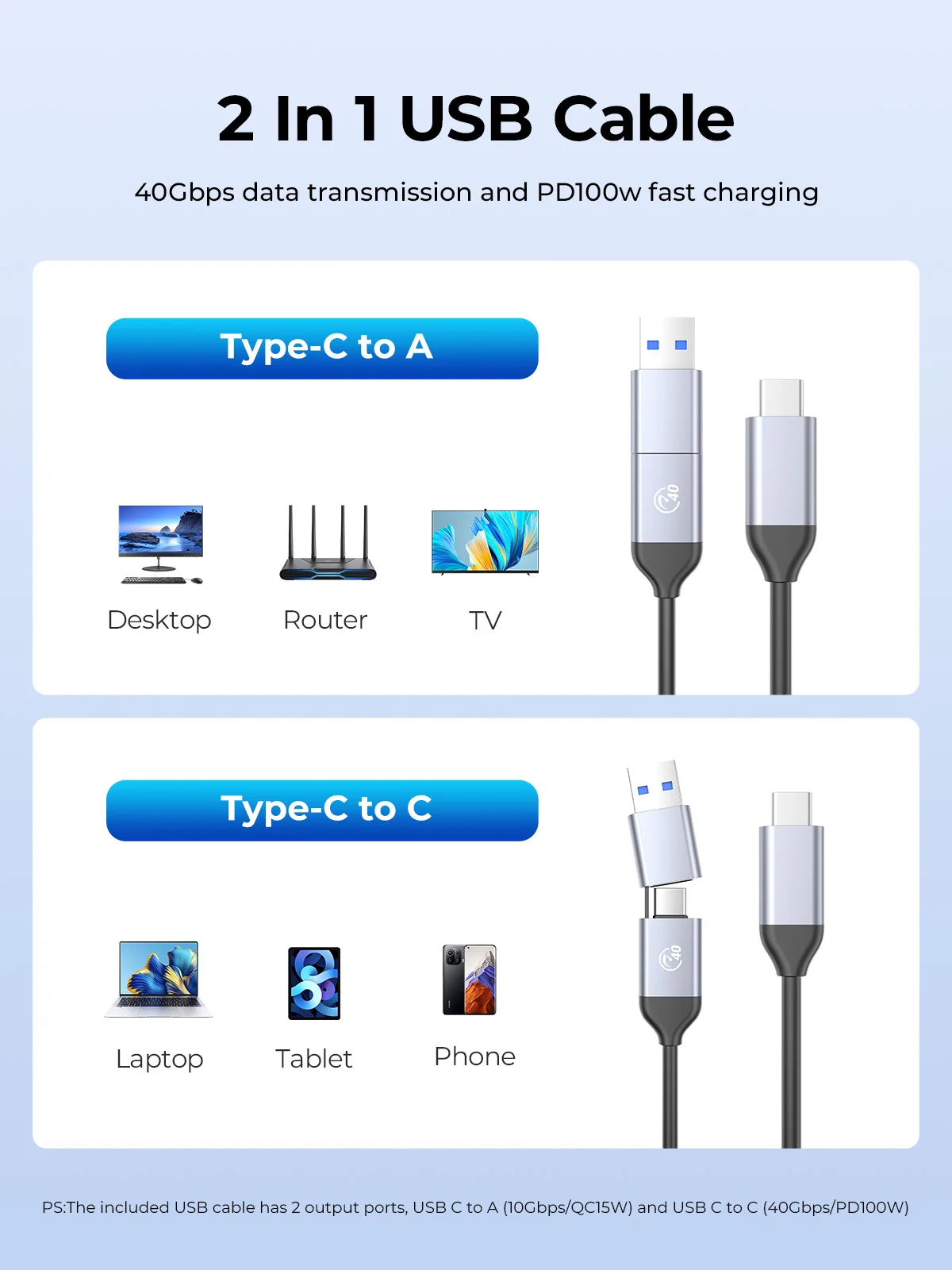 Cable 2 en 1 actualizado,USB C a C (40 Gbps/PD100W) y USB C a A (10 Gbps/QC15w).