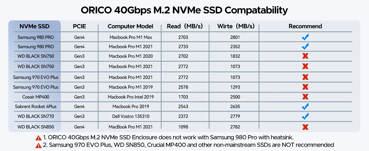 La carcasa ORICO 40Gbps M.2 NVMe SSD no funciona con Samsung 980 Pro con disipador de calor. No se recomiendan Samsung 970 EVO Plus, WD SN850, Crucial MP400 y otros SSD no convencionales.