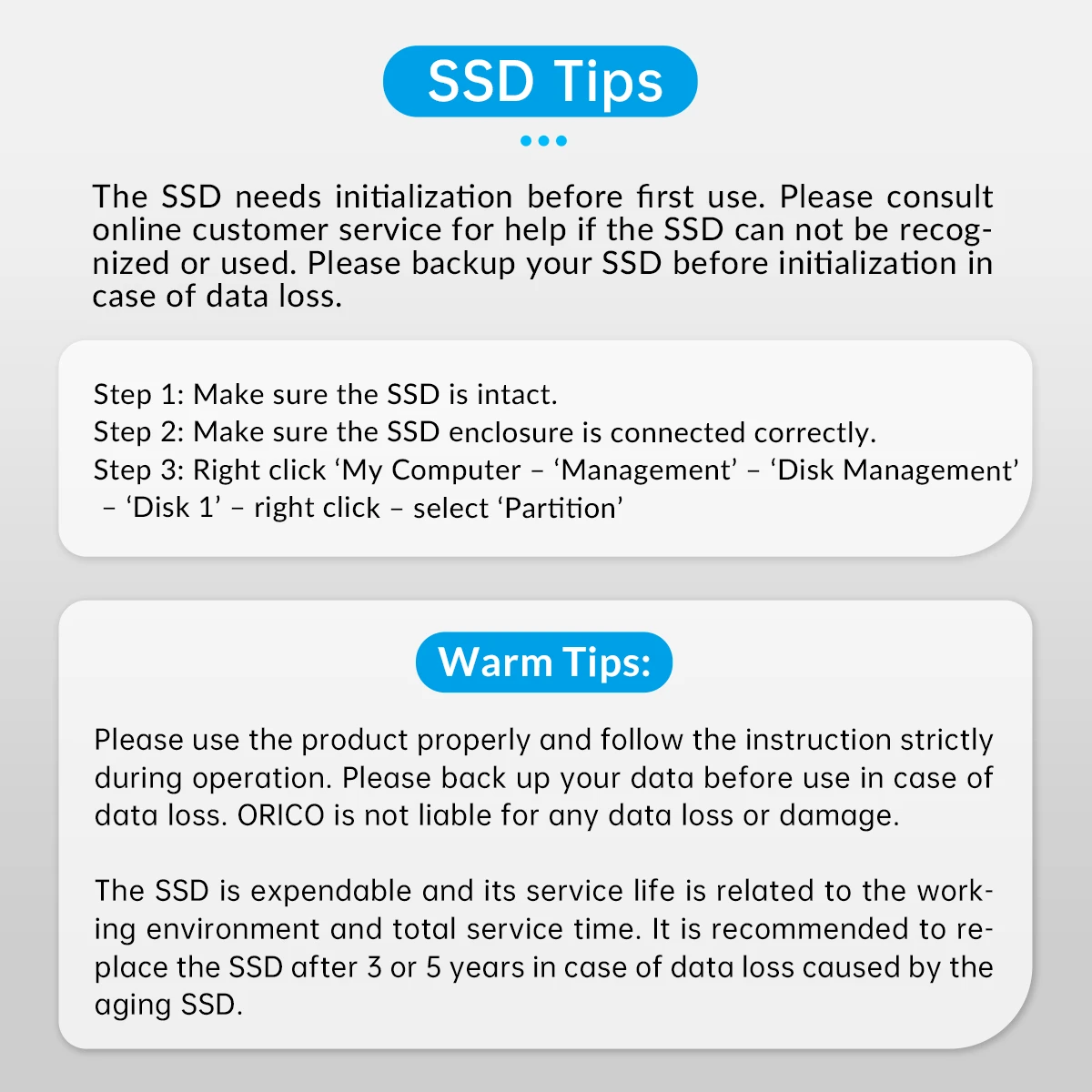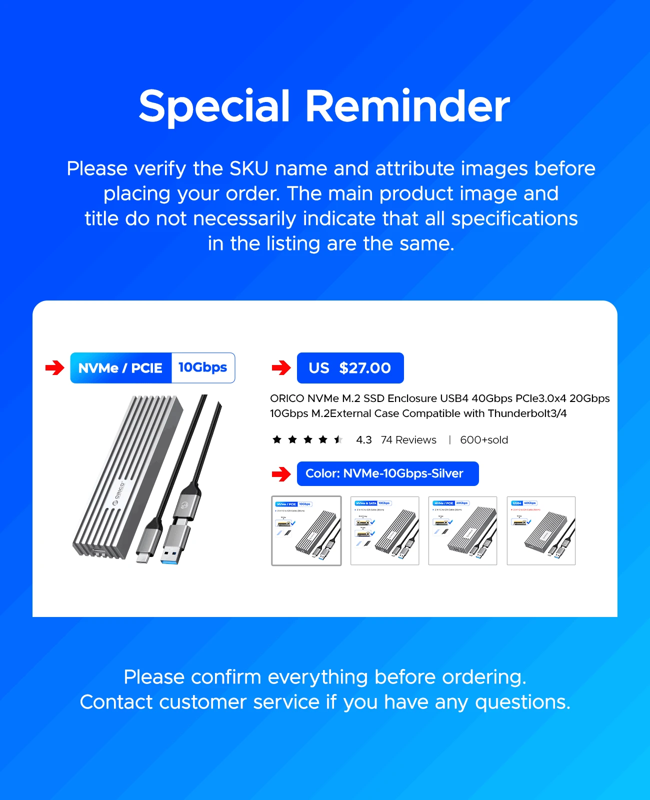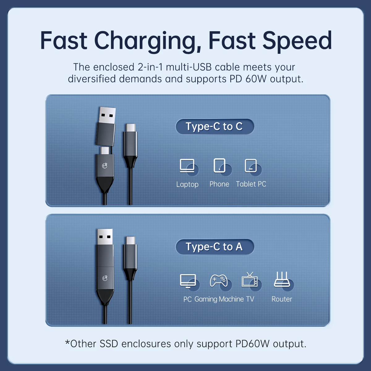 Support M Key(NVMe Protocol) / M&B Key (both NVME and SATA Protocol) SSD, not compatible with B Key SSD, with 30cm C to C/A 2-in-1 date Cable.
