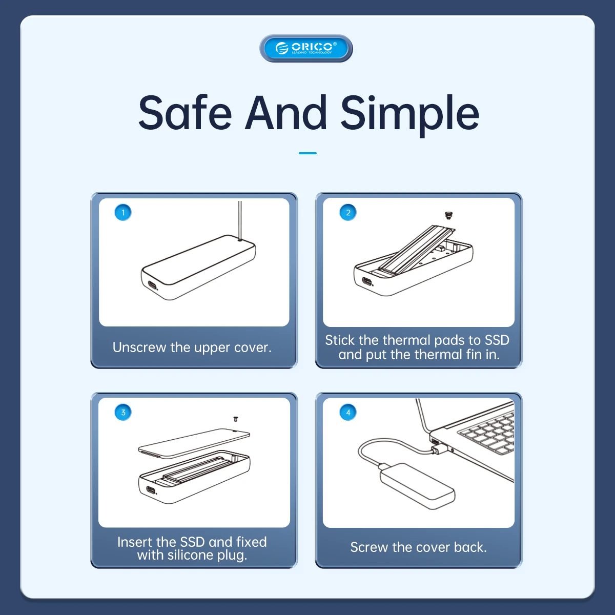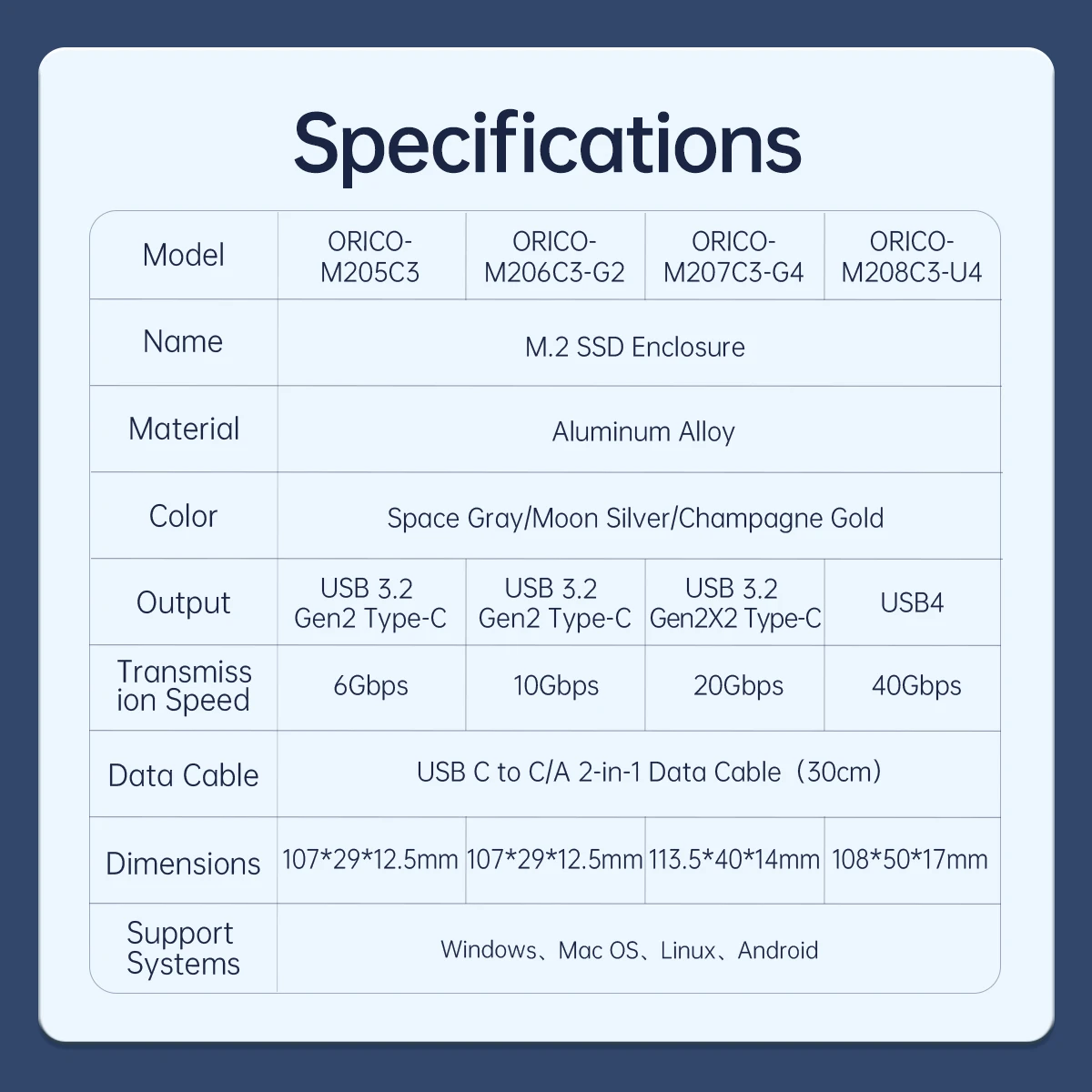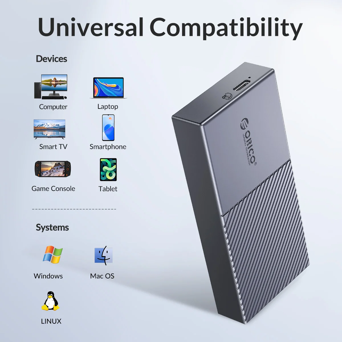 【Wide Compatibility】ORICO 40Gbps M.2 enclosure compatible with both M.2 PCIe NVMe M Key,NVMe B+M Key in sizes 2280. NOT Compatible with M.2 SATA SSDs, M.2 PCIe AHCI SSDs, M.2 PCIe devices. Support System Multi OS, Windows, Mac OS, Linux, Android. Plug and play, no drive and power supply required.