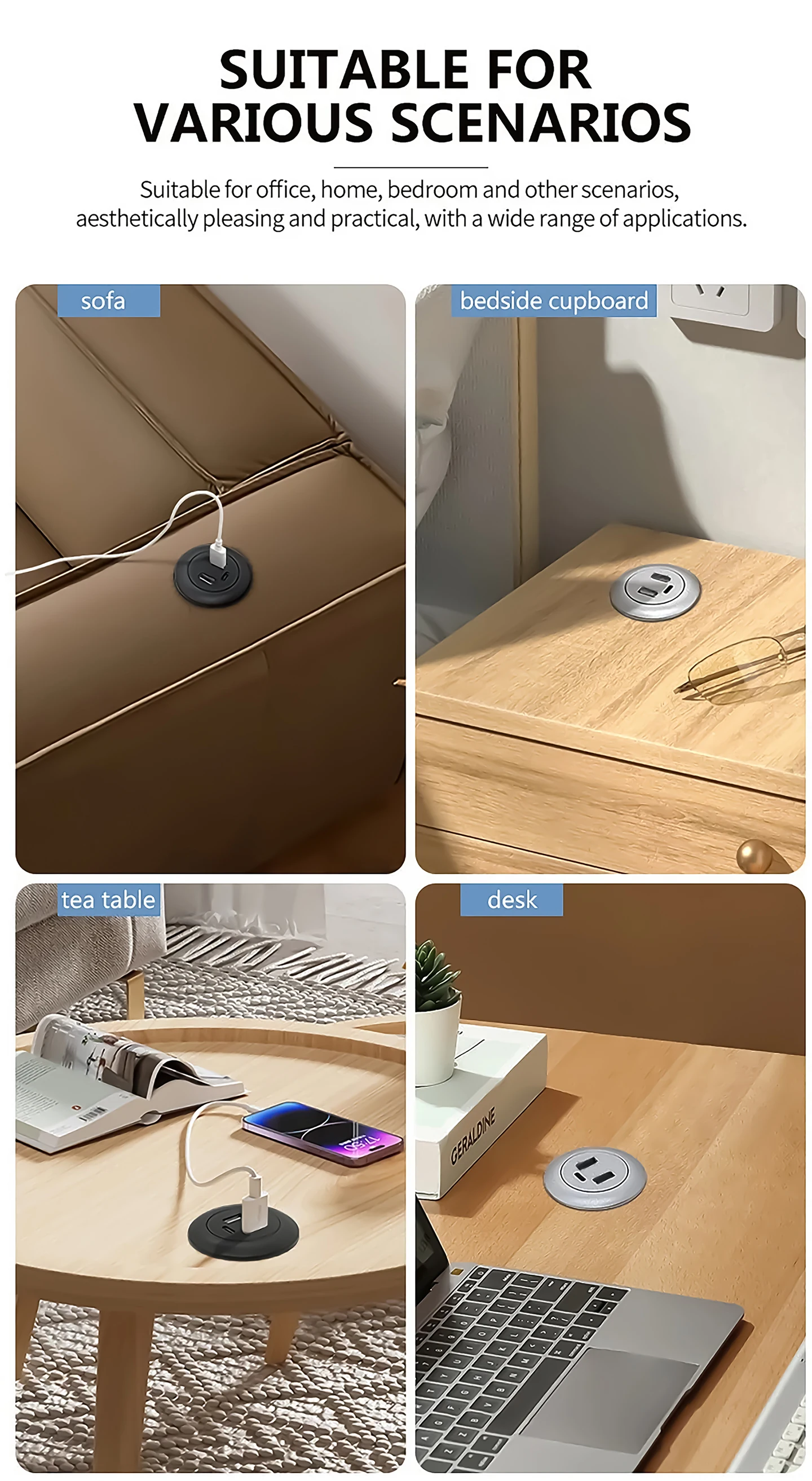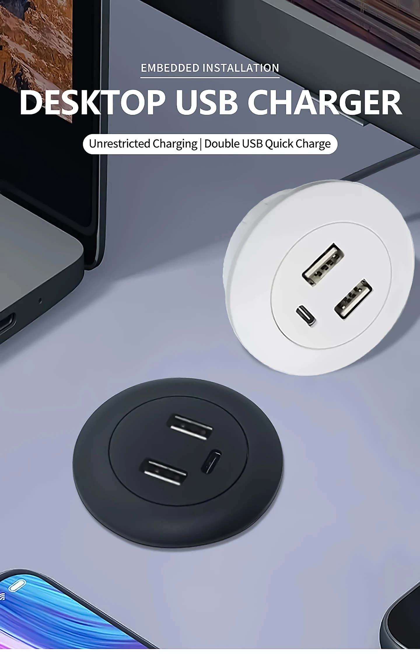 Convenience: the USB charger is small and light in design, and can be easily embedded into desks or household desktops. It is very suitable for offices, homes, conference rooms and other environments.