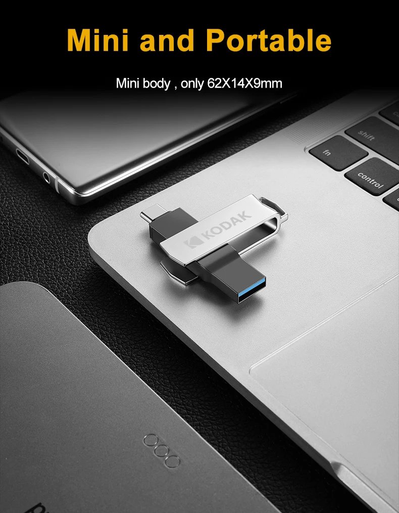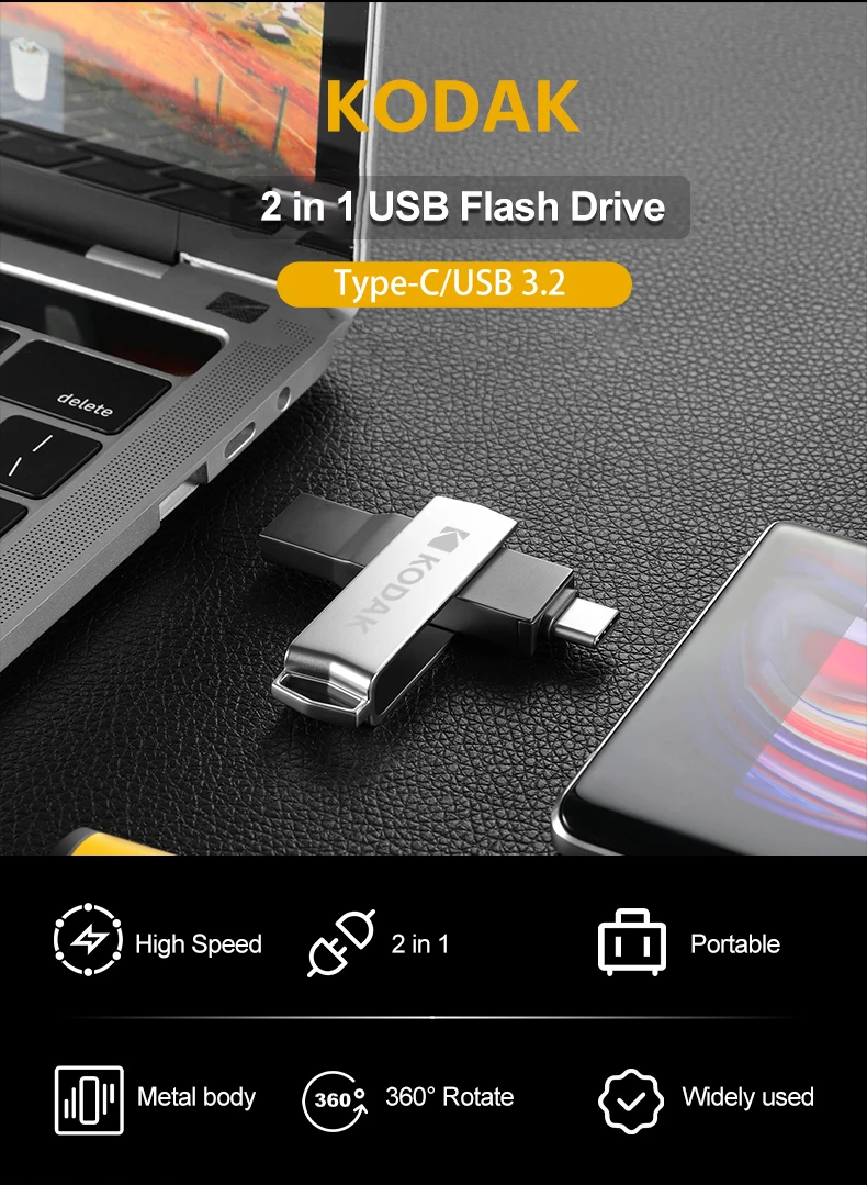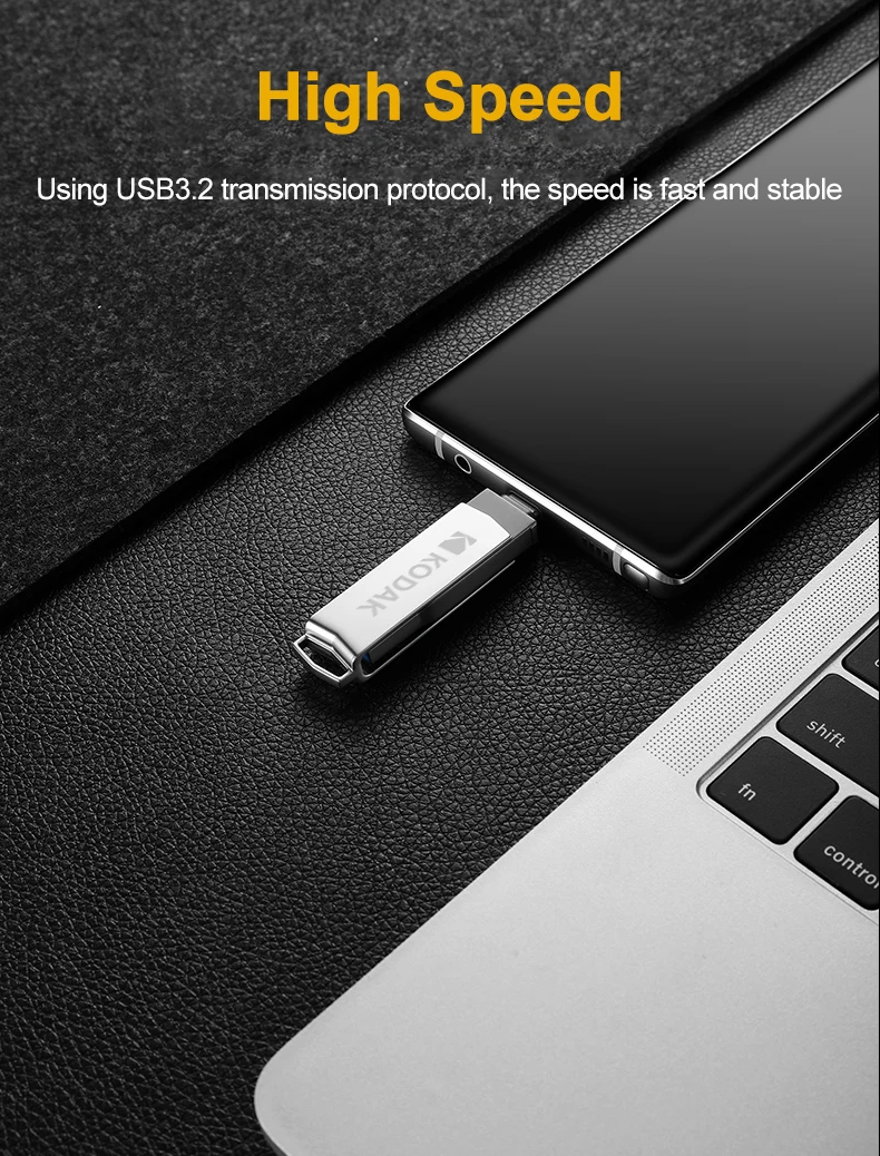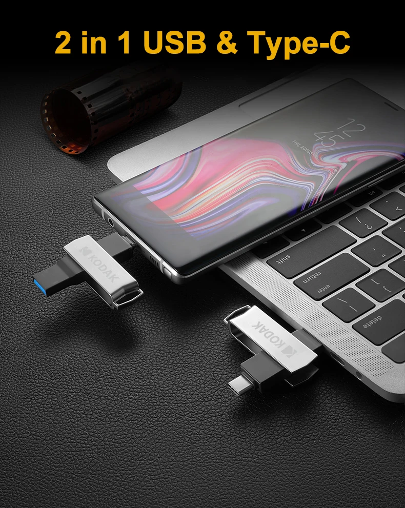 Velocidad: Velocidad de lectura: 40 MB/S-120 MB/S. Velocidad de escritura: 15 MB/S-40 MB/S. La velocidad depende del dispositivo host, la interfaz, las condiciones de uso y el tipo de dispositivo. Datos del sitio web oficial de Kodak.(Úselo en interfaces y dispositivos USB3.1 o superiores) Característica: Sistema compatible: Windows 10, 8, 7, Vista, XP / Mac OS 10.4 o superior / Linux 2.6.31 o superior. Dispositivo de soporte: computadora/portátil/TV/TV Box/reproductor multimedia para automóvil/Xiaomi, Samsung, Huawei, One Plus y otros teléfonos inteligentes Android (con función OTG). Sobre el uso: Plug and play (no se necesita software) Tipo de interfaz: Tipo-C/USB3.1/USB2.0 (Compatible). Cuerpo: Cuerpo de metal. Impermeable, a prueba de polvo, a prueba de golpes, Peso: Aproximadamente 17 g. Tamaño: 53 mm * 13 mm * 8 mm Garantía: 3 años. Sobre la capacidad: 32 GB Aproximadamente 28 GB-30 GB. 64 GB Aproximadamente 56 GB-60 GB. 128 GB Aproximadamente 115 GB-119 GB.