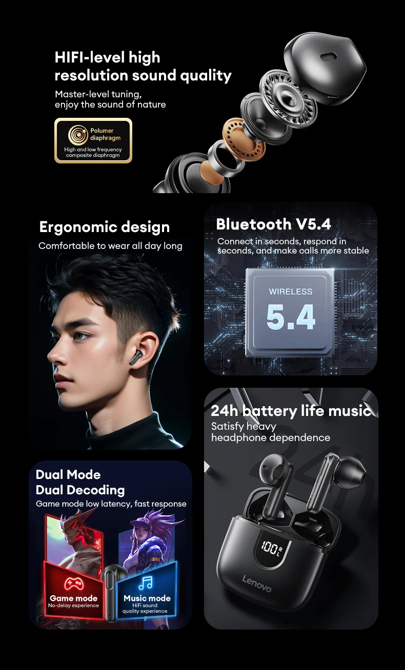 Calidad de sonido de alta resolución de nivel HIFlDiseño ergonómicoBluetooth V5.4Modo dualDoble decodificaciónMúsica con duración de batería de 24 horas