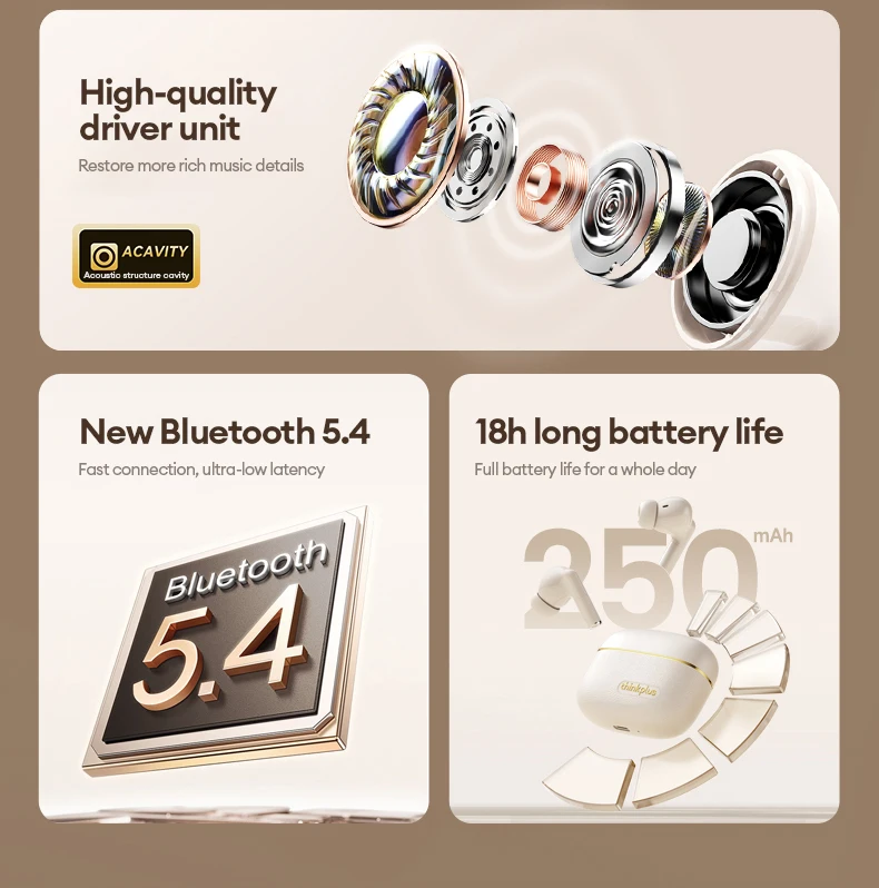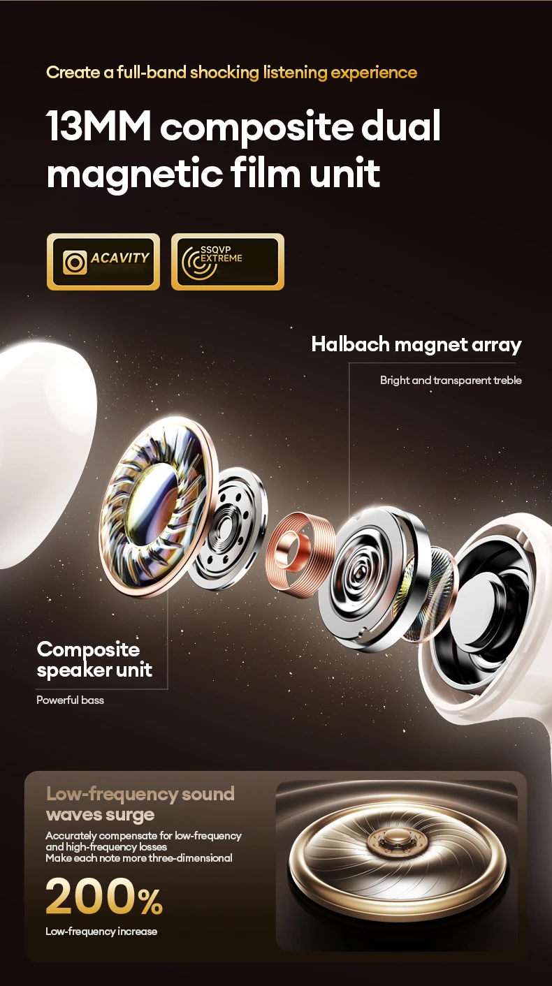 [Audio espacial inmersivo]: el diafragma grande de 13 mm ofrece agudos claros, medios sólidos y graves potentes. Los ricos detalles del escenario sonoro crean una experiencia auditiva de alta fidelidad inmersiva.[Cancelación de ruido ENC adaptable de 4 micrófonos]: 4 micrófonos detectan y cancelan dinámicamente el ruido ambiental (metro/viento/teclado) para llamadas nítidas como chats cara a cara.